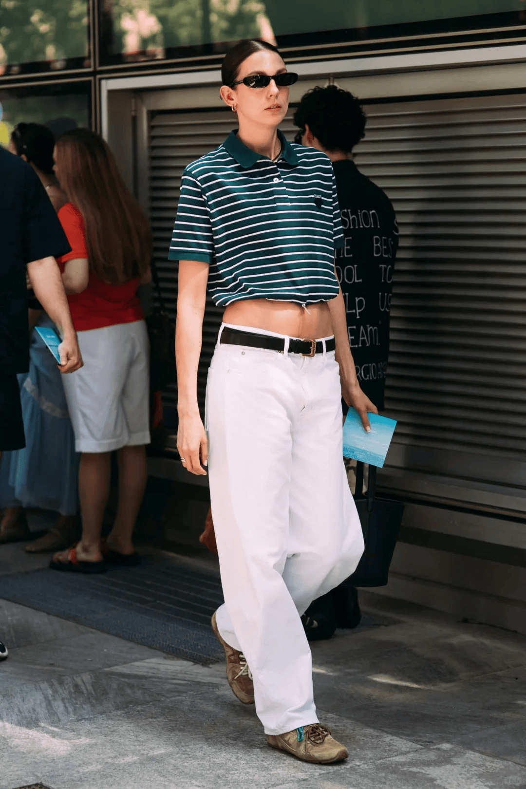 宽腿或低腰款式与短款、贴身Polo衫组合,更具当代松弛感和街头感。