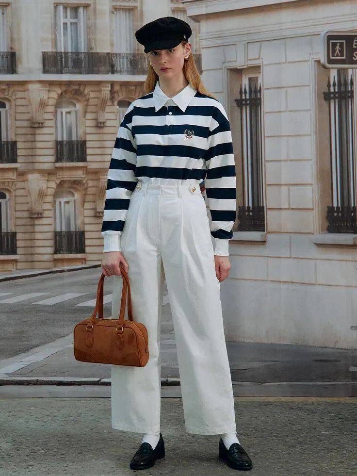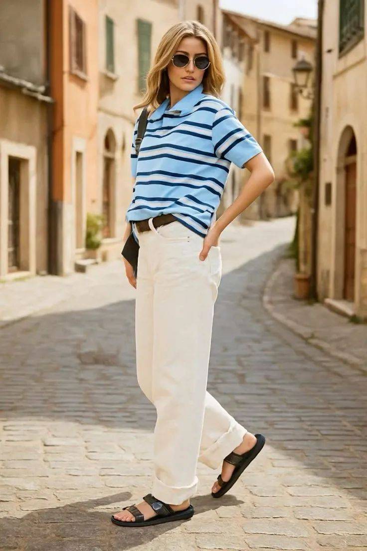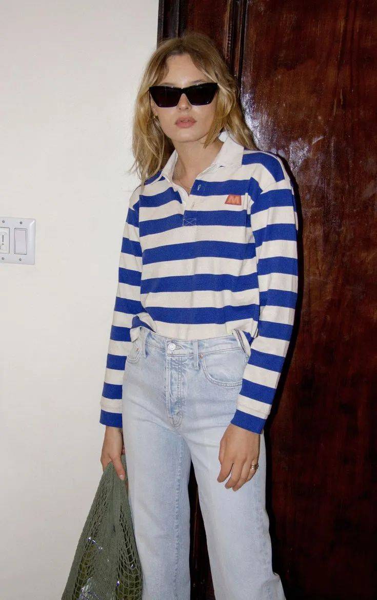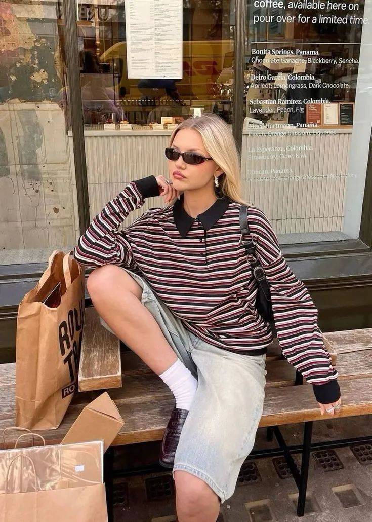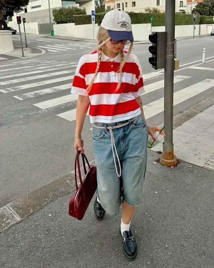 条纹元素的Polo衫也是夏日首选,红白、蓝白的对比色不仅有复古感,还让整体多了几分俏皮感。