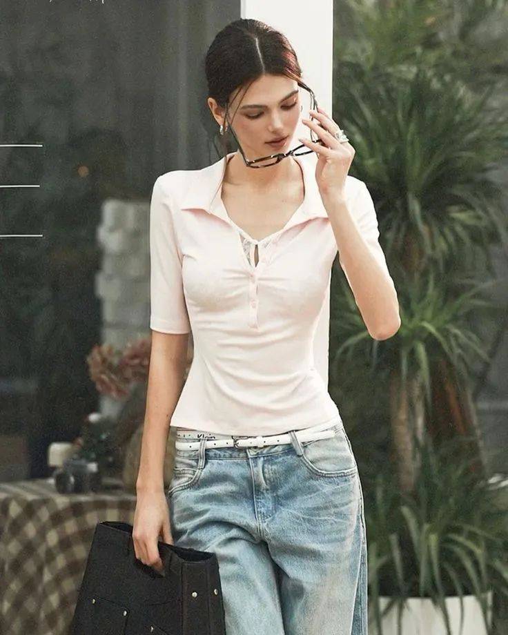 短款Polo衫或带拉链的设计更偏运动感,可以尝试和低腰或宽腿牛仔裤组合,拉出更强的街头感。