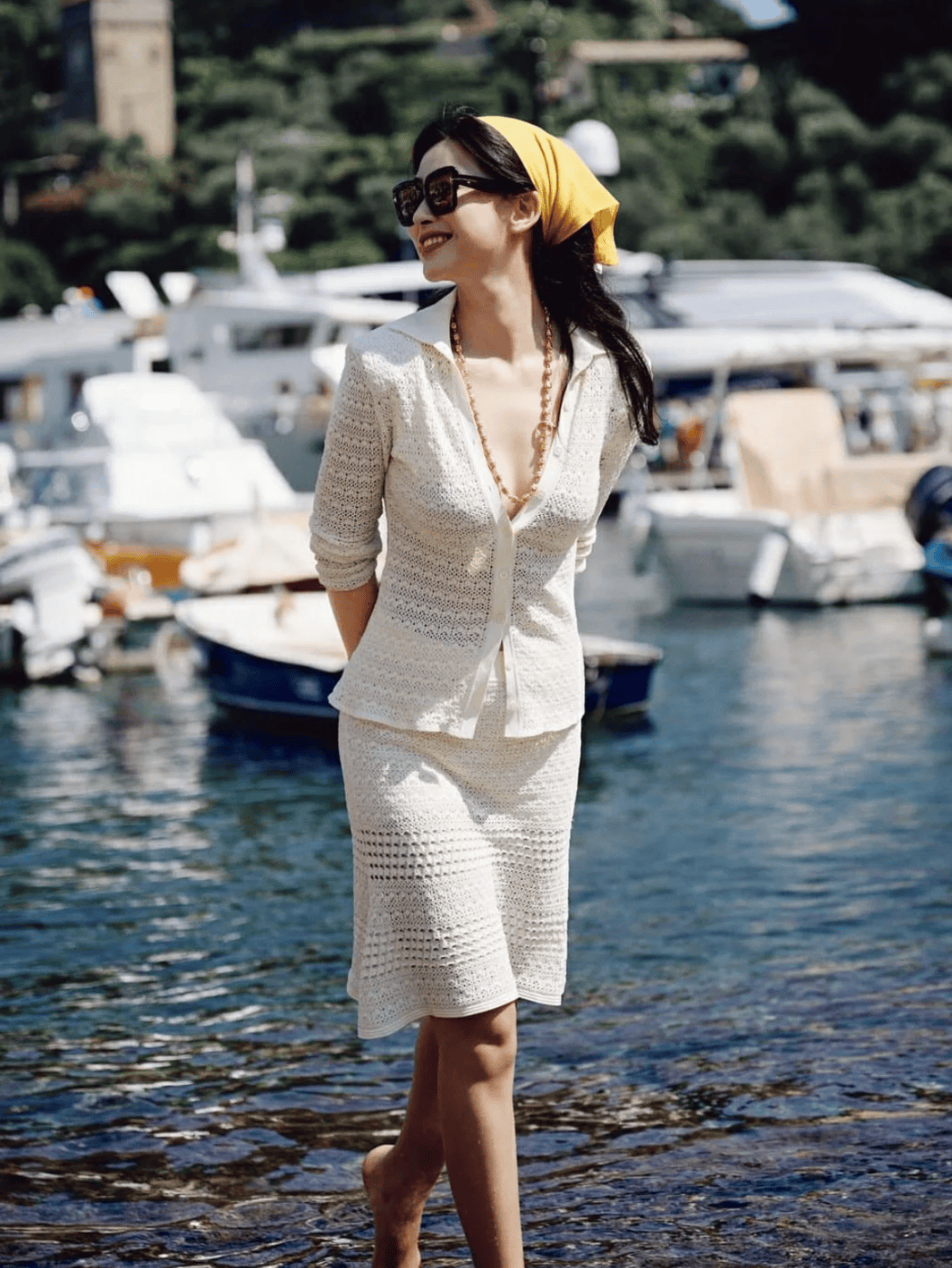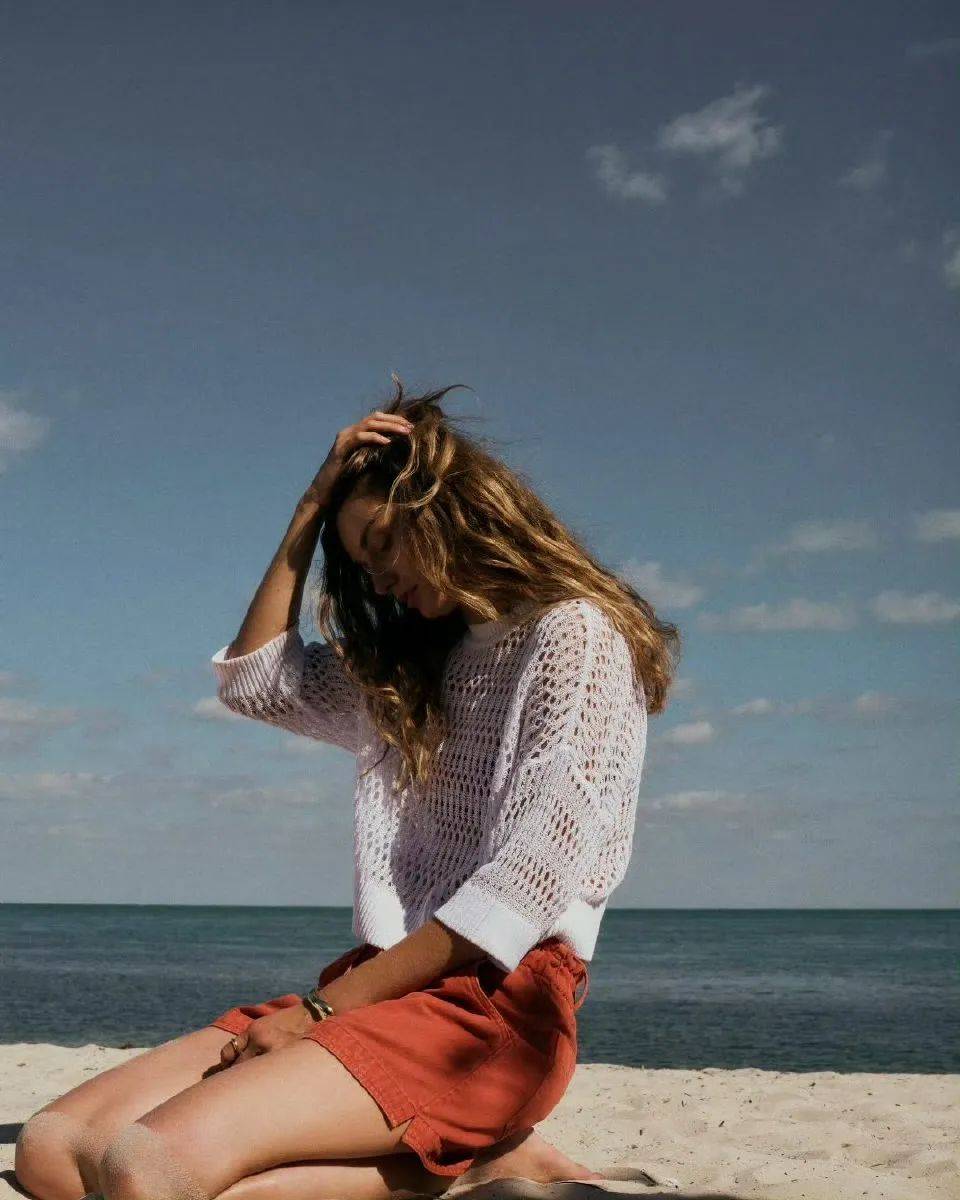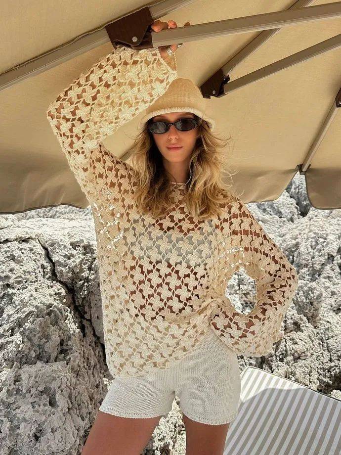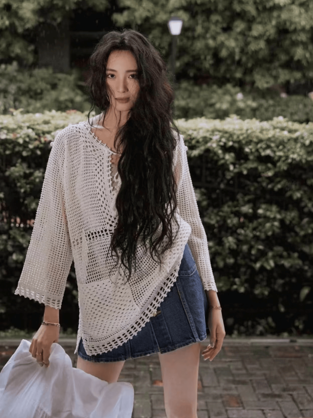 而宽松罩衫或套头款则更适合营造松弛度假感,像王紫璇的长袖钩针罩衫,穿着时仿佛身在轻风之中。
