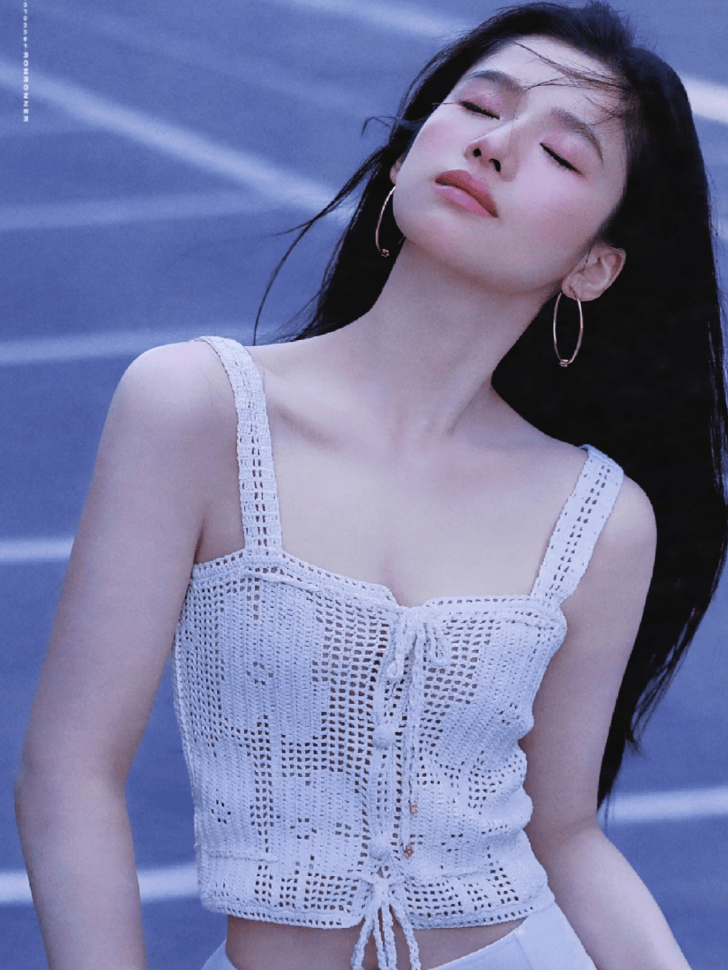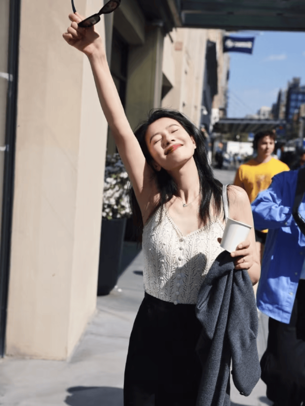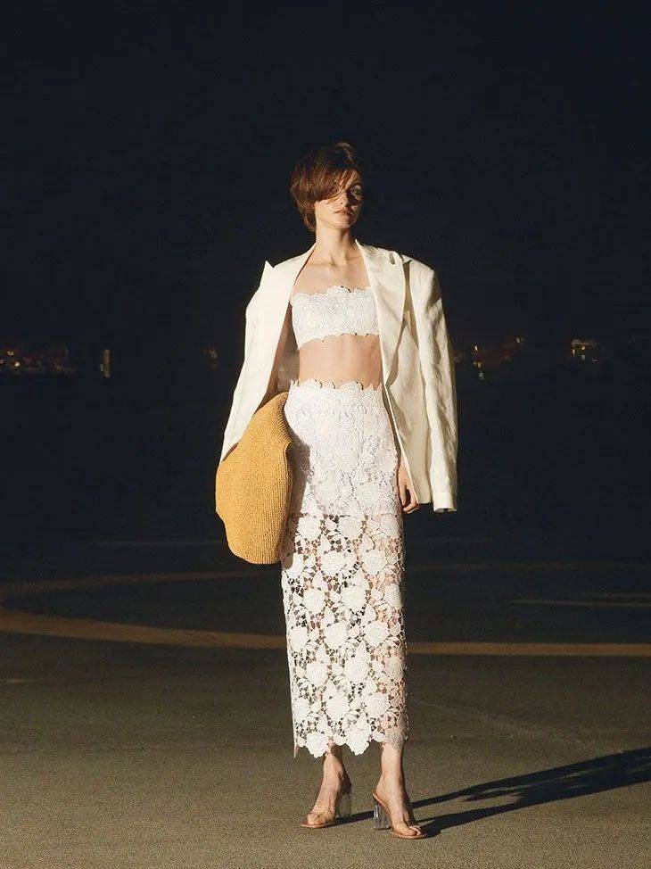 比如张婧仪这件米白色钩针背心,锁骨与手臂的若隐若现,恰如其分地展现了身体的美感。
