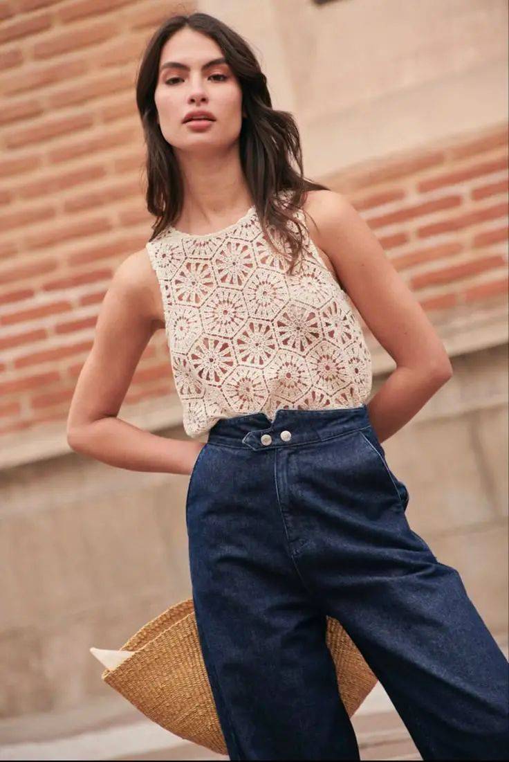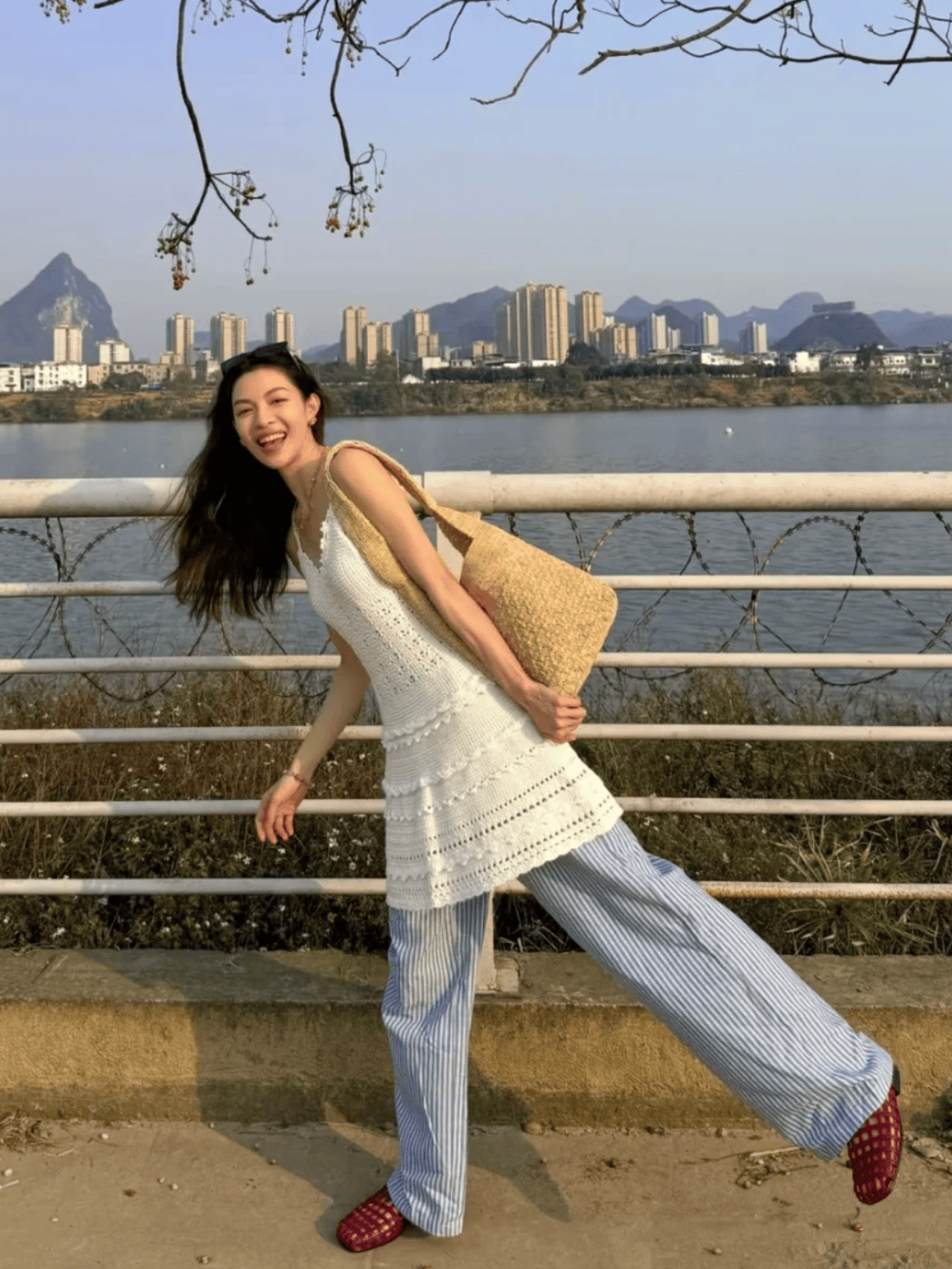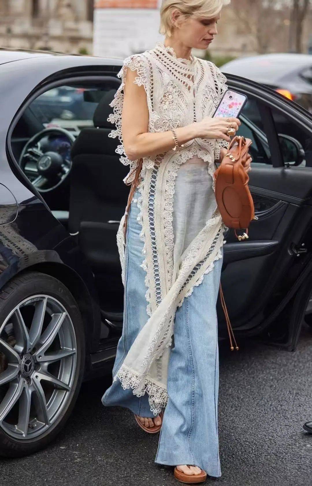 钟楚曦将钩针背心与牛仔裤混搭,展现都市感与松弛感的交汇。