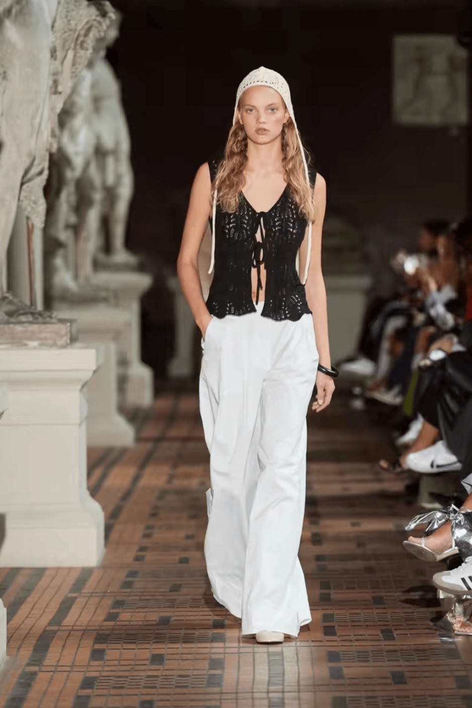 贴身的背心型适合强调身形,搭配硬挺下装如牛仔裤,整体风格简洁利落。