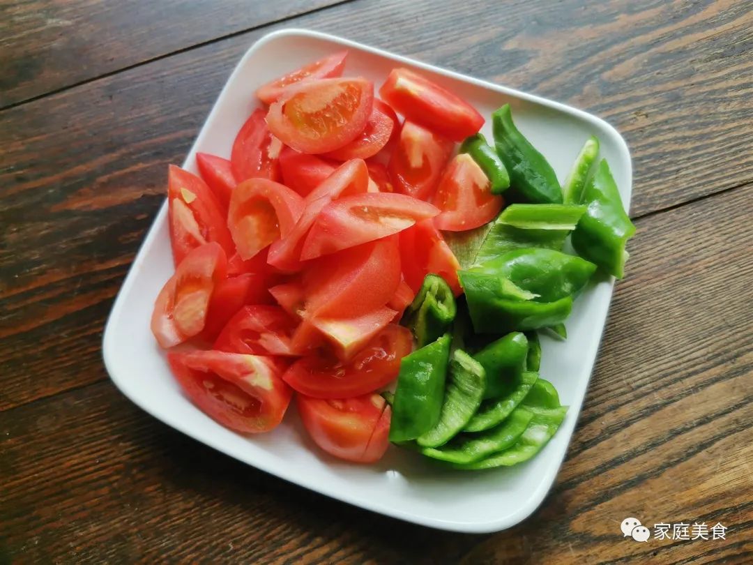 2.西红柿去蒂,切成块,尖椒去蒂去籽切成片。