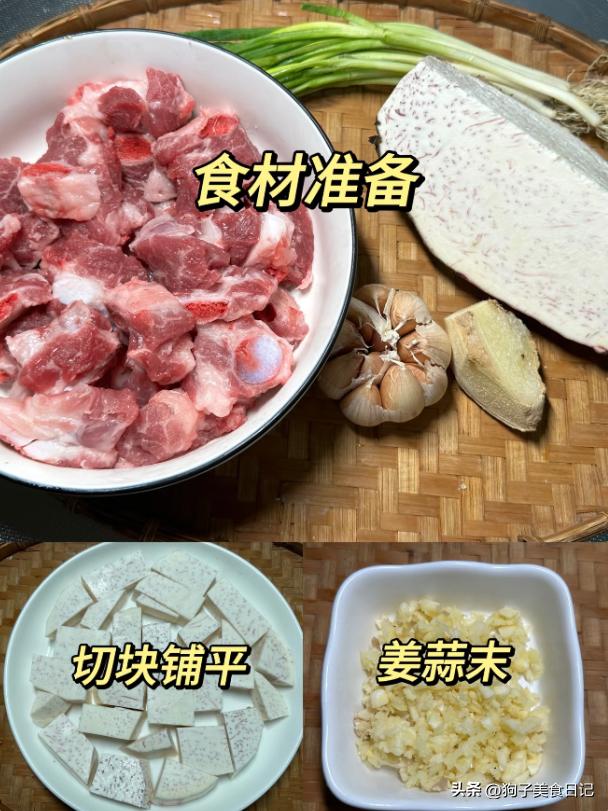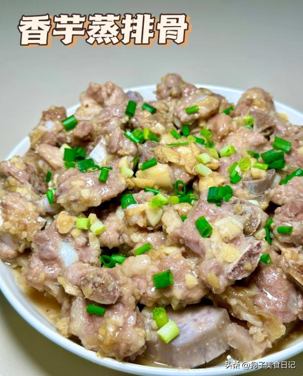 6.芋头蒸排骨 材料:适量排骨,适量大蒜,生姜,适量荔浦芋头,胡椒粉,玉米淀粉,蚝油,盐,葱花。