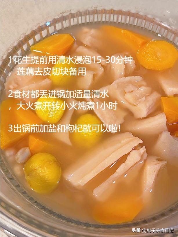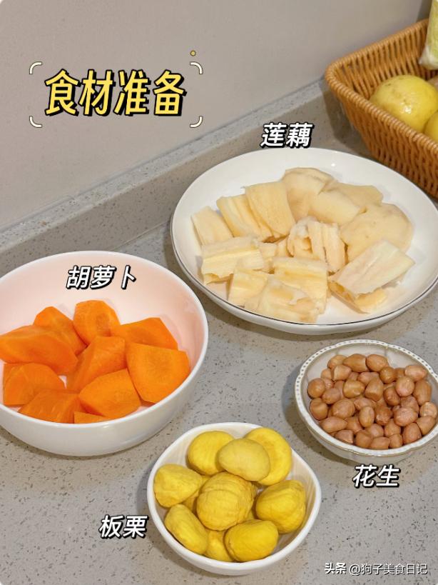 2.莲藕板栗花生素汤 材料:适量莲藕,适量胡萝卜,适量板栗,适量花生米。