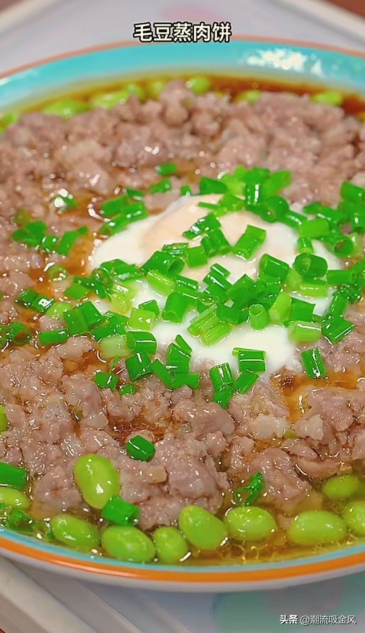 广东人从小吃到大的榨菜蒸牛肉,开胃又下饭。牛肉切好,加糖、胡椒粉、生抽、蚝油、葱姜水,抓匀后加淀粉、花生油。铺在盘子上,盖一层榨菜,大火蒸5分钟。牛肉嫩滑,榨菜咸香,拌米饭绝配。 第八道:毛豆蒸肉饼——猪肉和毛豆的神仙搭配