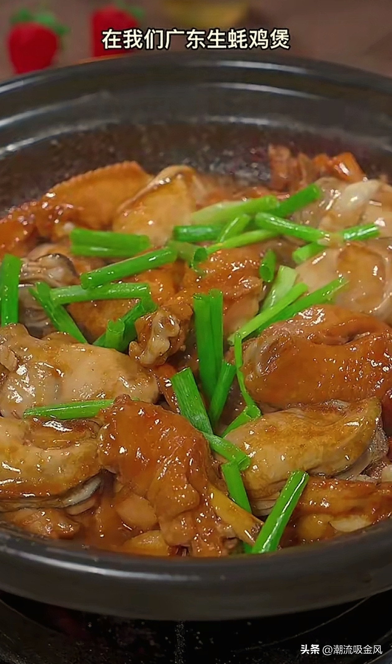 这道菜在广东太受欢迎了!鸡块用生抽、蚝油、生粉腌10分钟,煎至焦香。调个料汁:生抽、柱侯酱、白糖、清水。锅里爆香葱姜蒜,放鸡块、生蚝,淋料汁,大火焗5分钟,沿锅边淋米酒再焗3分钟。开盖那一刻,香味能把整个小区馋哭,鸡肉入味,生蚝鲜美。 第六道:蛤蜊蒸蛋——小朋友抢着吃的营养菜