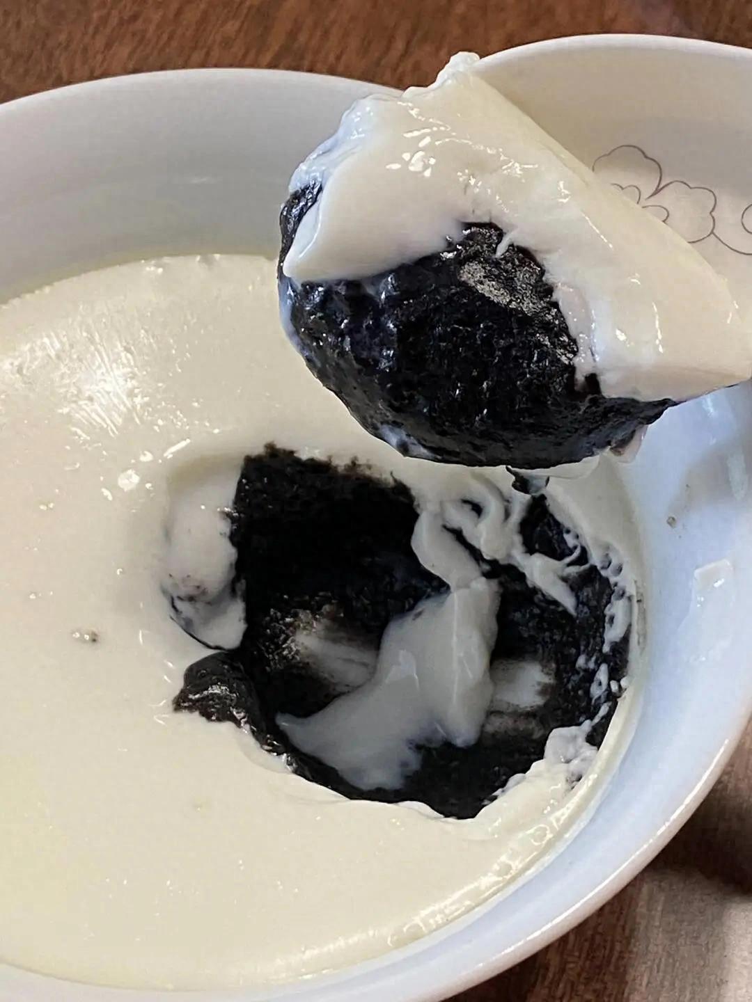 我半信半疑的,在爷爷的指导下给自己做了一碗,流心的黑芝麻糊+滑嫩炖鲜奶,浓香甜润,Q弹爽滑,没想到这味道绝了! 爷爷说,还可以加点桂花蜜那味道更香了,可惜家里没有。