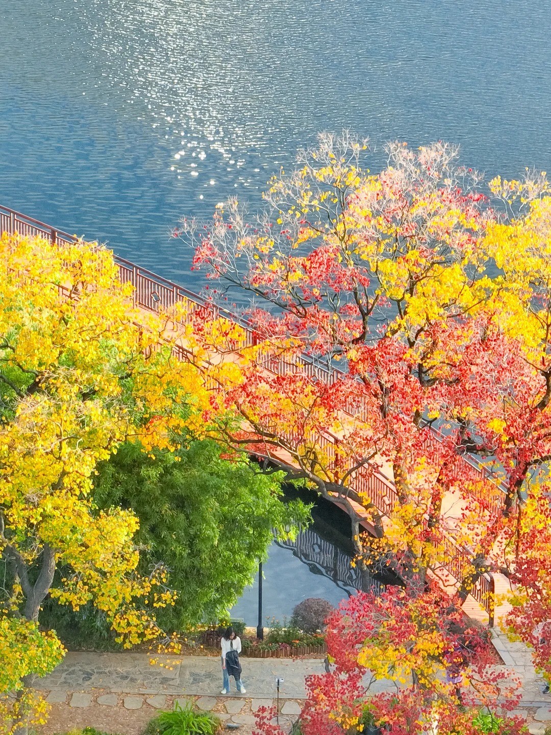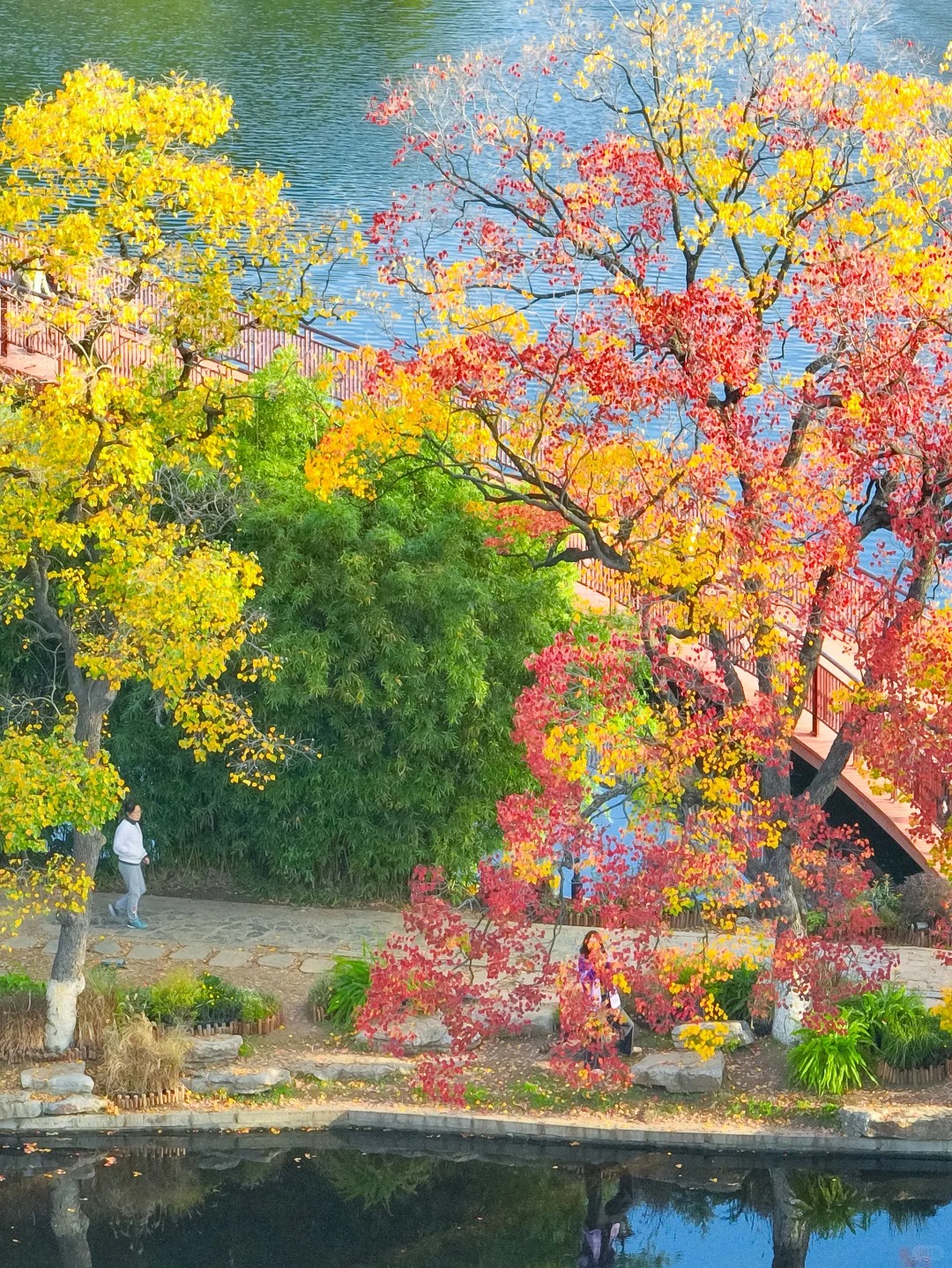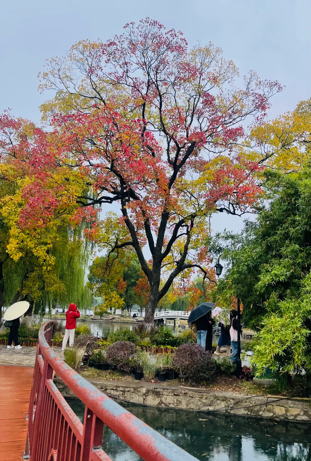 4. 书画院&鸢尾园:小众秘境,人少清净 想避人就去书画院和鸢尾园。书画院旁乌桕密集,俯身透过叶隙拍湖面,光斑晃着像童话;鸢尾园小桥边,红枫乌桕映水中,用小桥做前景,照片层次感拉满。