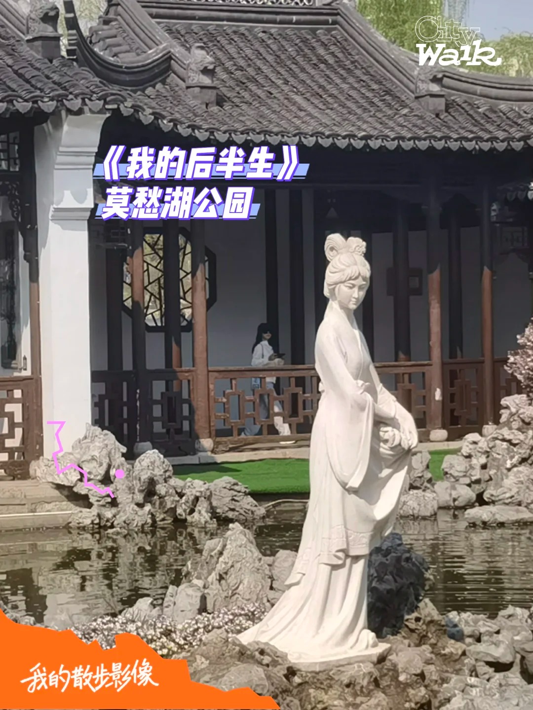 黄昏是抱月楼最佳观赏期,夕阳镀楼檐金边,湖面映楼影,远处乌桕红彤彤,站楼上远眺全湖秋景,红黄绿三色配波光,心情瞬间开朗。 3. 莫愁女雕像:传说与秋景共生 莫愁女汉白玉雕像是灵魂景点,手捧莲花衣袂飘。秋日里银杏红枫落叶铺地,湖水做背景,拍景拍人都有故事感,还能联想南齐莫愁女的善良传说。