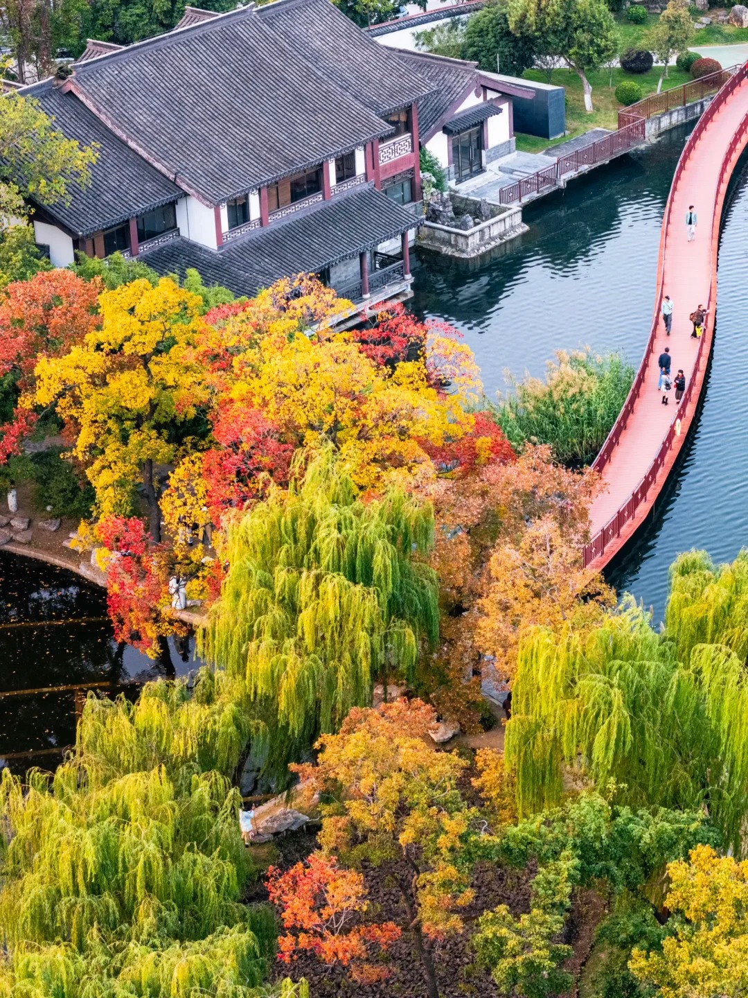 2. 银杏+红枫:撞色CP,古风感拉满 除了乌桕,银杏和红枫也是宝藏——红配黄像“西红柿炒蛋”鲜活,配中式亭台,古风大片随手来。 楹联长廊中间的银杏林广场,11月后满树金黄,落叶踩着沙沙响。旁侧红木家具馆粉墙黛瓦配银杏,穿素色衣服站着就出古风写真;莫愁女雕像旁的高大银杏,金黄叶片衬汉白玉雕像,湖面映倒影,温柔又有韵味。