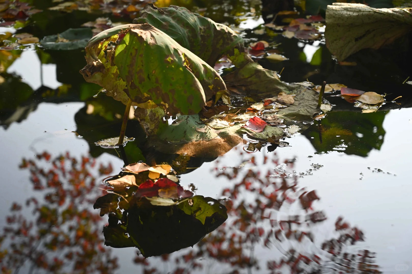 3. 残荷+野趣:清寂中藏着灵动 秋日莫愁湖连残荷都有韵味!沿湖荷花池里,干枯荷梗立在清水里像墨画,水鸟掠过添灵动。抱月楼两侧无患子11月变黄,落叶铺金径;十月中下旬菊花盛放,红木家具馆旁湖北海棠结红果,都是小众出片点。