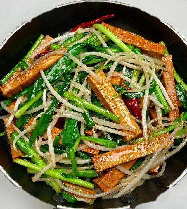 4. 加入韭菜: 下韭菜段,淋入生抽和盐,所有食材一起大火翻炒30秒即可出锅。口感丰富,豆干的香、韭菜的鲜、豆芽的脆完美结合。