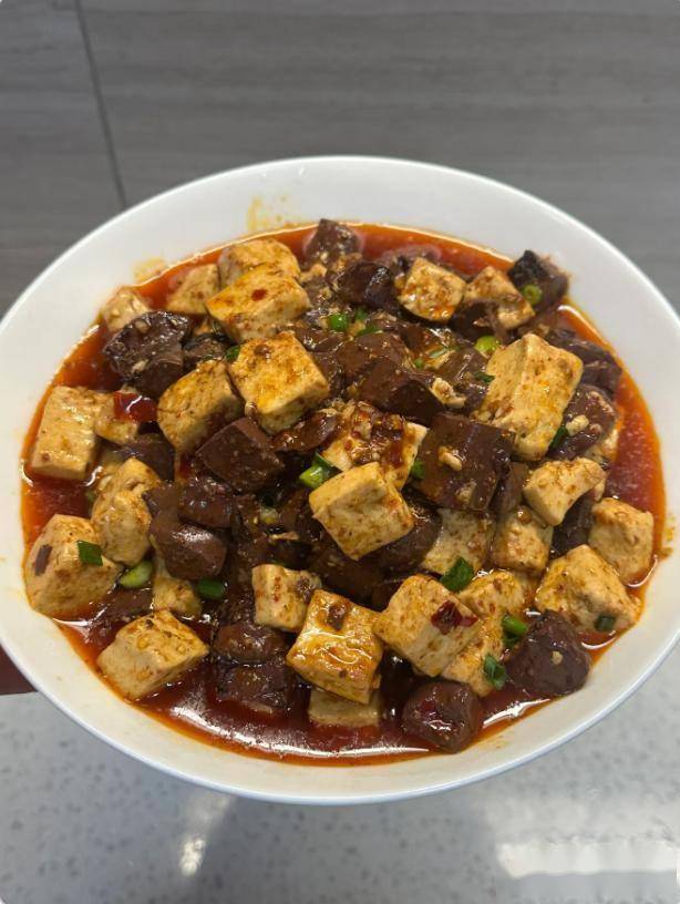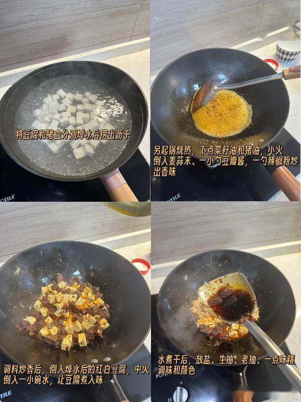 2.红白豆腐 材料:一块豆腐,一块猪血,水淀粉,姜蒜末,一小勺豆瓣酱,一勺辣椒,盐,生抽,老抽,味精,花椒粉,葱花。