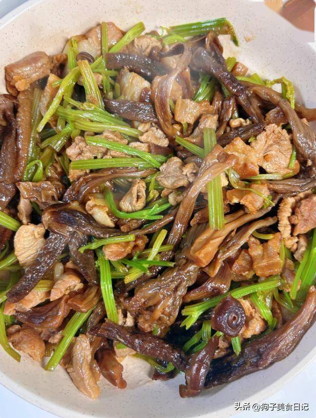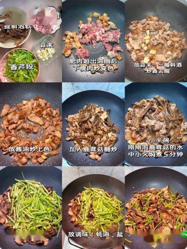 4.鹿茸菇炒肉片 材料:适量鹿茸菇,适量五花肉,大蒜末,适量香芹段,酱油,蚝油,盐。