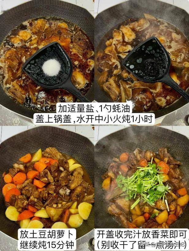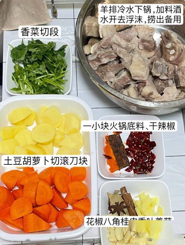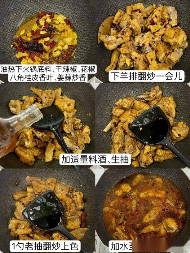 5.红烧羊排 材料:适量羊排,香菜,土豆,胡萝卜,一块火锅底料,干辣椒,花椒,八角,香叶,姜蒜。生抽,老抽,料酒,