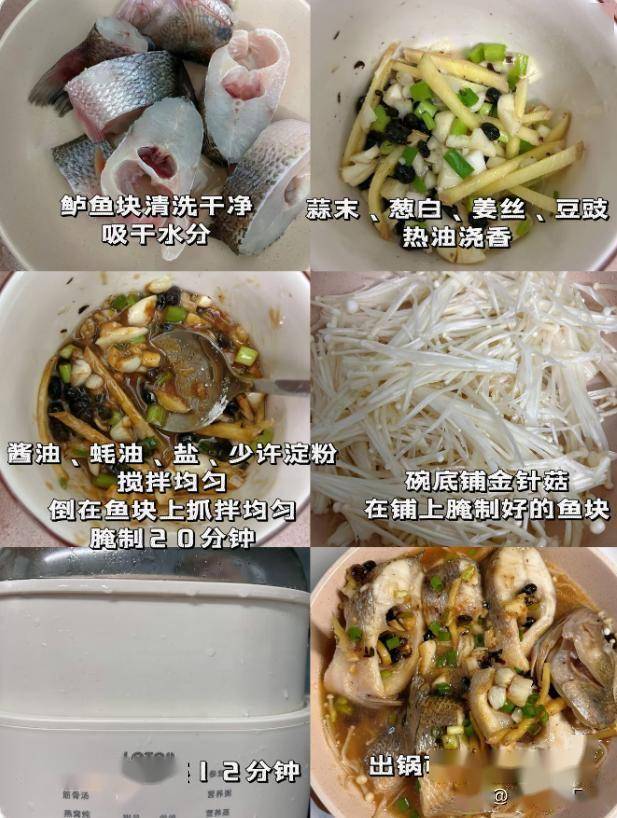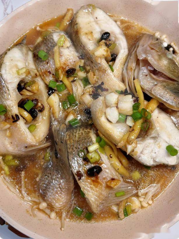 3.豆豉蒸鲈鱼 材料:一条鲈鱼,大蒜末,葱白,生姜丝,豆豉,热油,酱油,蚝油,少许淀粉,金针菇,葱花。