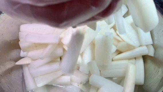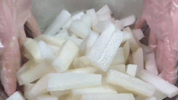 6 腌好的萝卜条,杀出了很多的水分,下手攥干萝卜里面的水分,尽量把萝卜里面的水分挤干一些,这样吃起来的口感特别的脆爽。