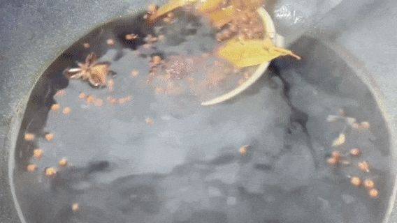5 起锅倒入调好的料汁,再放入一小把花椒,两个八角,两片香叶开大火把酱汁煮开,熬开后改中小火把它煮至两分钟左右,把所有食材的香味全部煮出来,然后用漏勺把锅中的香料全部过滤出来,再把熬好的酱汁倒入大碗里面,放凉备用。