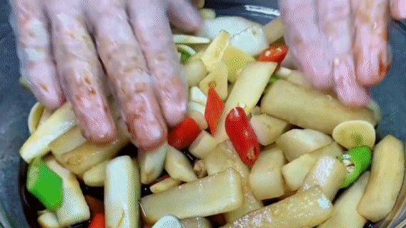 7 再把挤干水分的萝卜条,放入无油无水的大碗里面,把姜蒜片和青红椒全部加进来,倒入放凉的料汁,直接下手充分的抓拌均匀,再下手把萝卜按压紧实,让所有的萝卜浸泡在汤汁里面,最后盖上一层保鲜膜,放入阴凉处腌制3个小时左右。