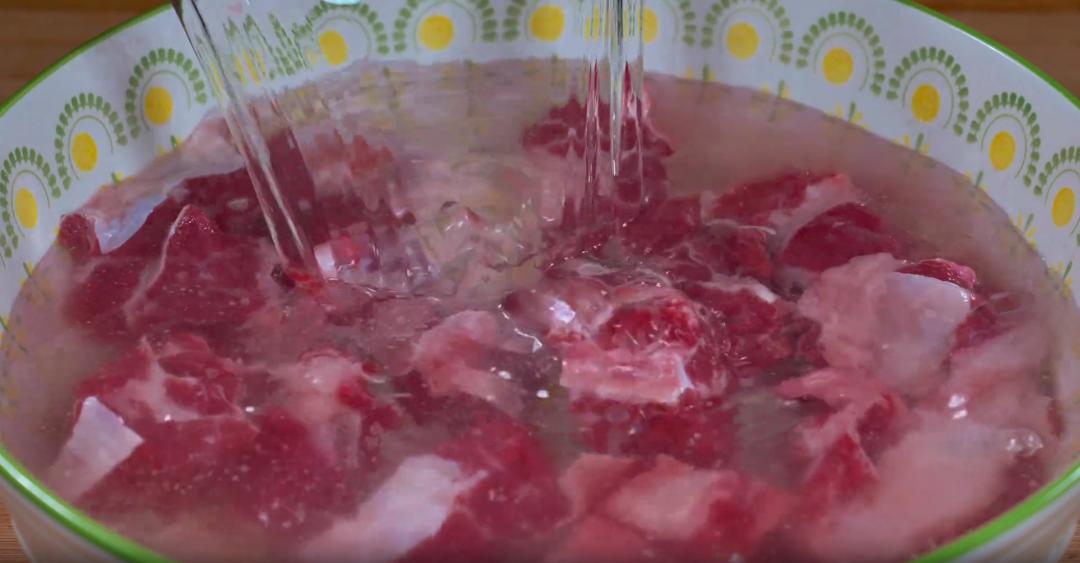 7、下一步将焯水的牛肉,直接捞出来,放入提前准备好的温水中,给它简单清洗一下,洗掉表面残留的浮沫,这里一定要用温水来清洗,用冷水的话,做出来牛肉就会发柴、发硬。