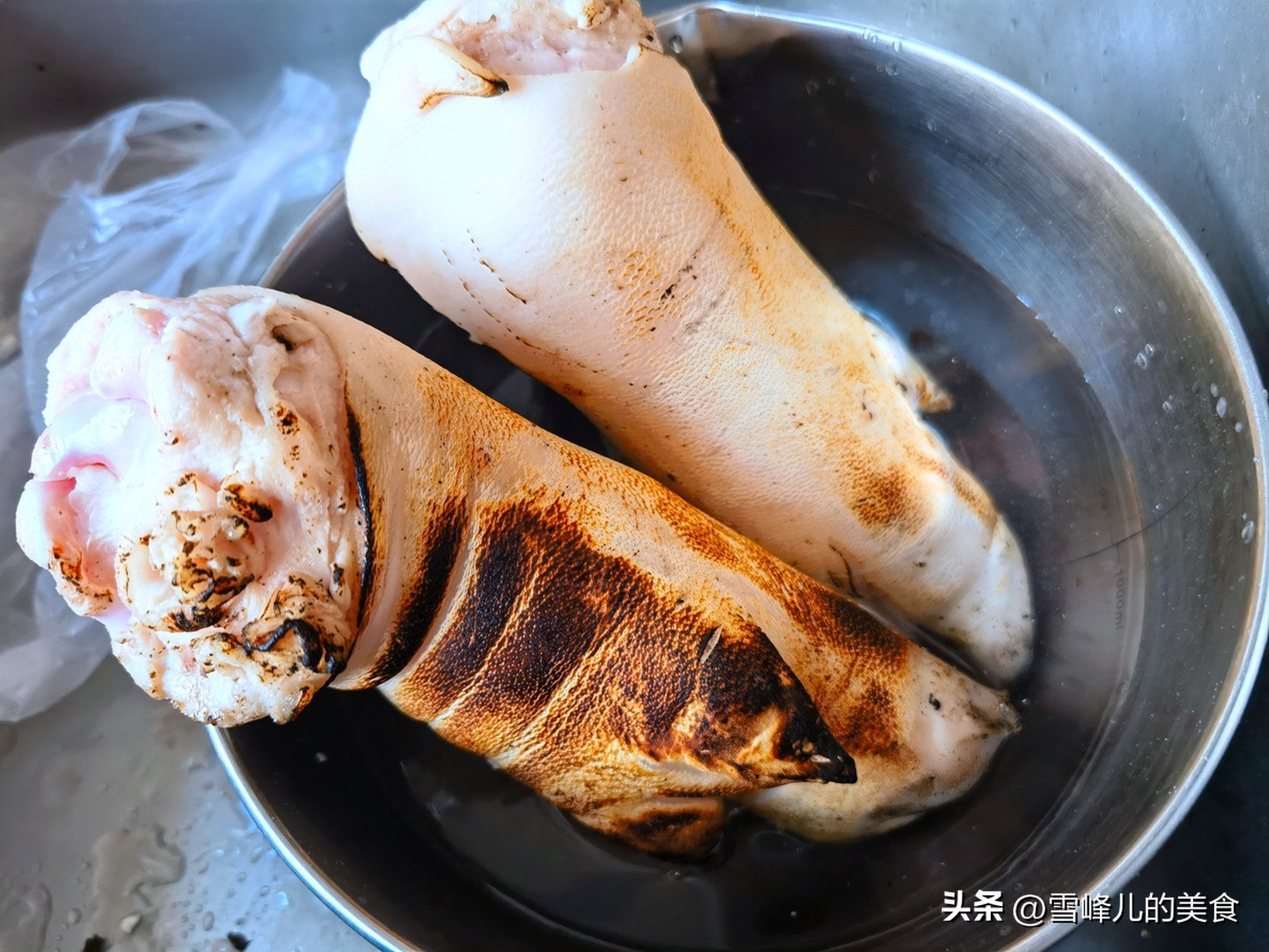 第一步:猪蹄买回家用火烤一下外面的小毛毛,也可以有效去除猪蹄的异味。