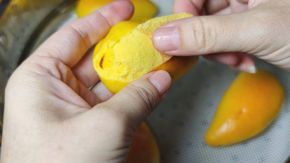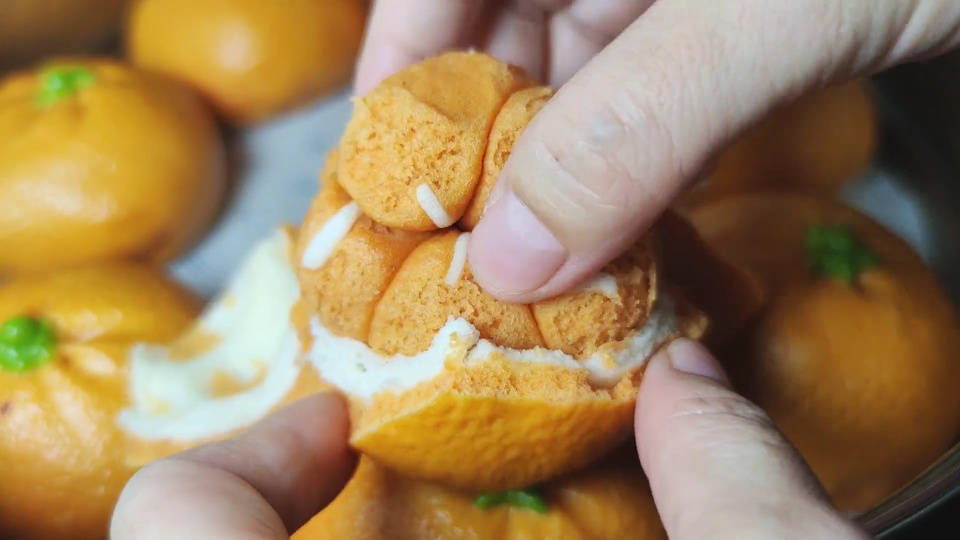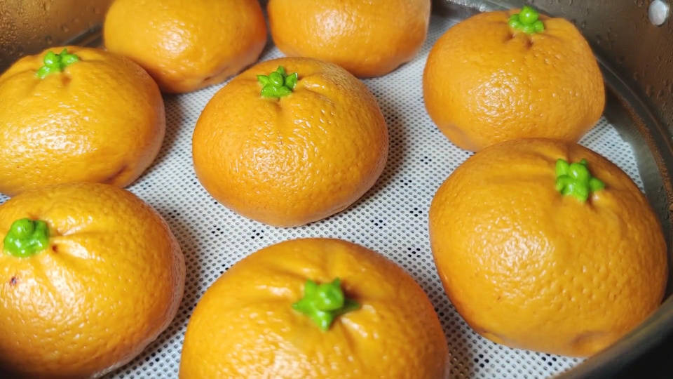视频画面中这些黄澄澄的橘子乍一看像一个小小的皮球,属实惹人喜爱,可当凑近一瞧却又发现它们不是真实的水果,只是用面食复刻了果皮外表的细节,而当掰开橘子之后,里面的果肉也是还原得惟妙惟肖。