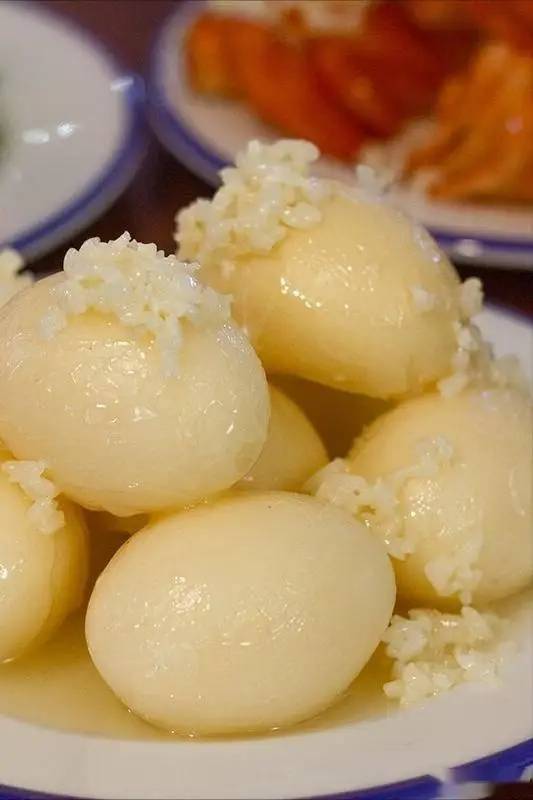3. 糟蛋: 嘉兴糟蛋是江南独有的美味,堪称 “时间酝酿的惊喜”。选用新鲜的鸭蛋为原料,经过清洗、晾干,再放入装满酒糟的坛子里密封腌制。酒糟的醇香慢慢渗透进鸭蛋里,让蛋白从液态变成半凝固的凝胶状,蛋黄也变得软糯鲜香,整个过程全靠时间的沉淀。 腌制好的糟蛋,蛋壳呈淡淡的淡黄色,轻轻敲开,蛋白滑嫩如凝脂,带着浓郁的酒糟香,入口绵密细腻,咸鲜交织,没有一点蛋腥味。它既是佐餐的小菜,也能当零食吃,搭配白粥、米饭都超合适,一口下去,满满的江南风味,是老嘉兴人钟爱的 “下饭神器”。