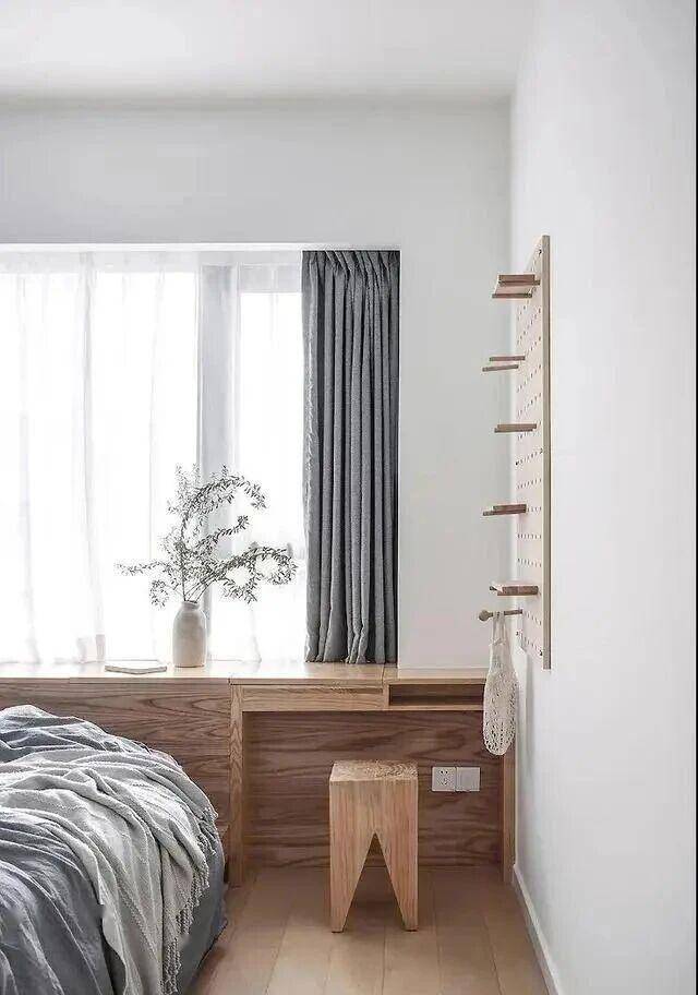 主卧打破了传统 “床 + 床头柜” 的固化装修,将墙壁从白色换成了暖灰色,搭配原木家具,依旧可以和整个家居基调相呼应。 主卧采用地台加床垫的形式,床的对面还装了一排洞洞板,各种小物件都能挂上去,大大提高了空间利用率。