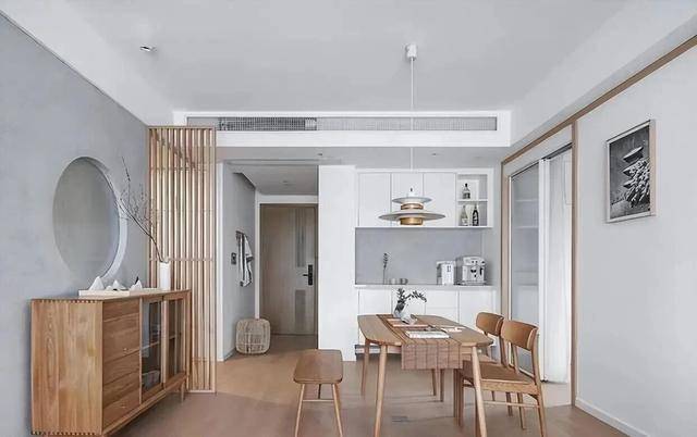中式设计里常见的圆形元素,被这位博主用留白的方式悄悄融合了进去; 大白墙搭配木质屏风、一束干花,再配上窗外的雪白山景,瞬间就有了一种空灵、静谧的禅意。