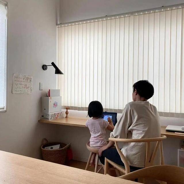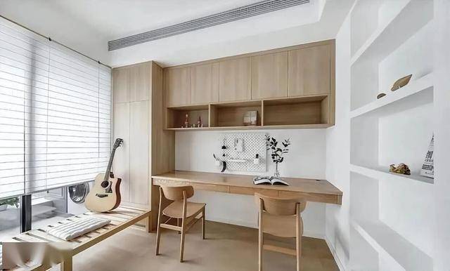 书房也依旧延续了大白墙设计,双人位的书桌搭配书柜,空间充足,两个人同时使用也互不打扰。 四处也定制了收纳柜,杂物全能收起来,书房能一直保持整洁,工作学习时自然能更专注。