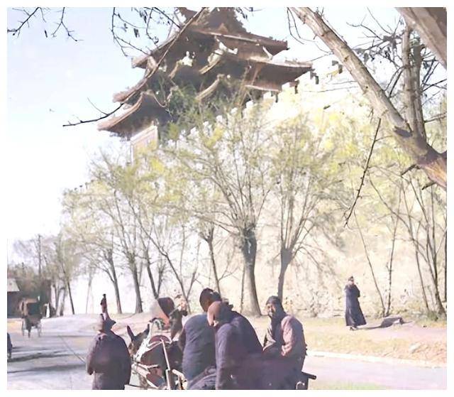 △古老的牌坊下,四位女士悠闲散步,旁边的车夫则好奇地望向她们。