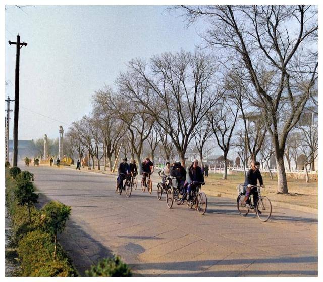 △在那个年代,街道上几乎没有车水马龙,行人稀少,自行车是主要的交通工具。