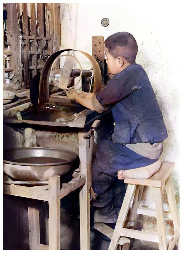 △天桥附近,一家古玩店的学徒正在专心打磨玉坠。这个年纪本该在学校读书,却不得不做学徒,这反映了当时人们生活的艰辛。