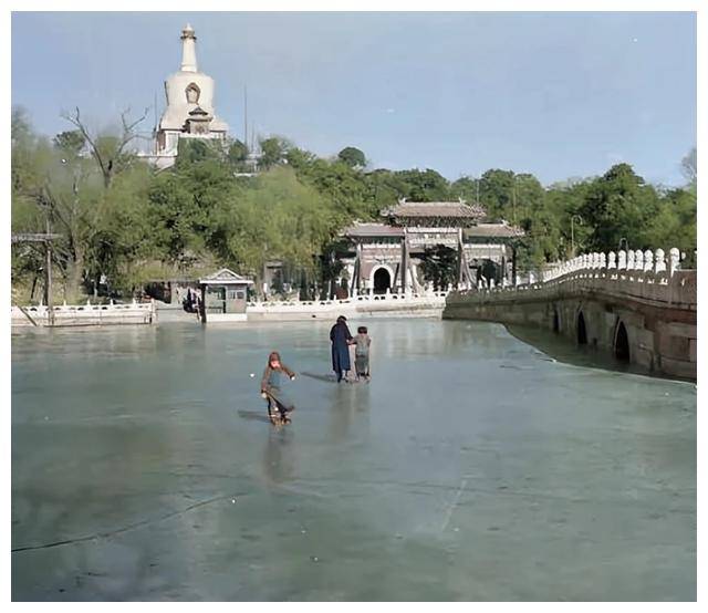△北海的白塔旁,溜冰场的人们在冰面上尽情嬉戏,展现了当时的人们对休闲生活的追求。