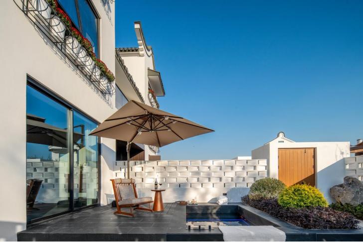 25.飞云岛—墩上云里 墩上云里民宿枕山而居、伴云而栖,名字便藏着“墩上揽云,汤泉入梦”的诗意。民宿将徽派建筑的马头墙、白墙黛瓦与现代度假的轻盈感相融,错落的建筑在蓝天映衬下如悬浮于云间,庭院里草木葱茏,石板小径蜿蜒,一步一景皆是远离尘嚣的闲适。 内设带独立汤池的云境客房、露台观云汤池、禅意茶室、全景休闲厅等空间,每一处汤池都依景而建,温热泉水与山间流云相映,是疗愈身心的核心体验。 地址:奉贤区金汇镇墩头村230号 预订电话:13167237032