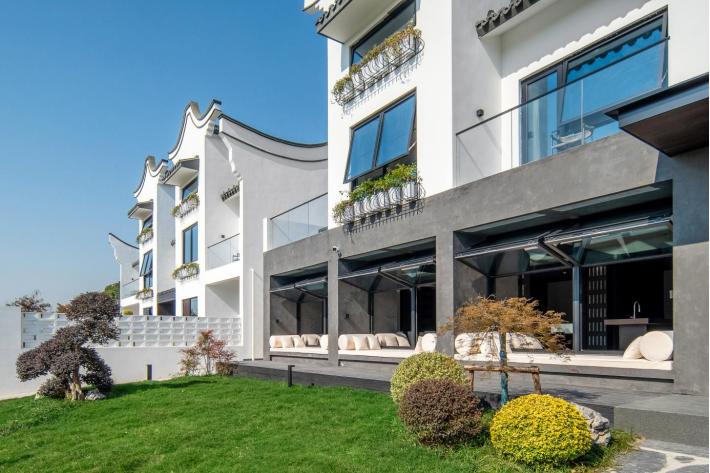 24.飞云岛—墩上金里 墩上金里民宿坐落于山水之间,以“墩上栖居,金里禅意”为核,将徽派建筑的婉约与东方禅意的空灵相融。民宿占地约2000平方米,内集私汤客房、禅意庭院、全景休闲露台、静心茶室、徽派美学休憩区、露天汤池于一体。 这一处藏于徽派白墙黛瓦里的禅意居所,青草地衬着极简的灰白建筑,镂空景墙、枯山水造景勾勒出禅意肌理,汤池隐于庭院与露台间,水汽氤氲里满是松弛。 地址:奉贤区金汇镇墩头村230号 预订电话:13167237032