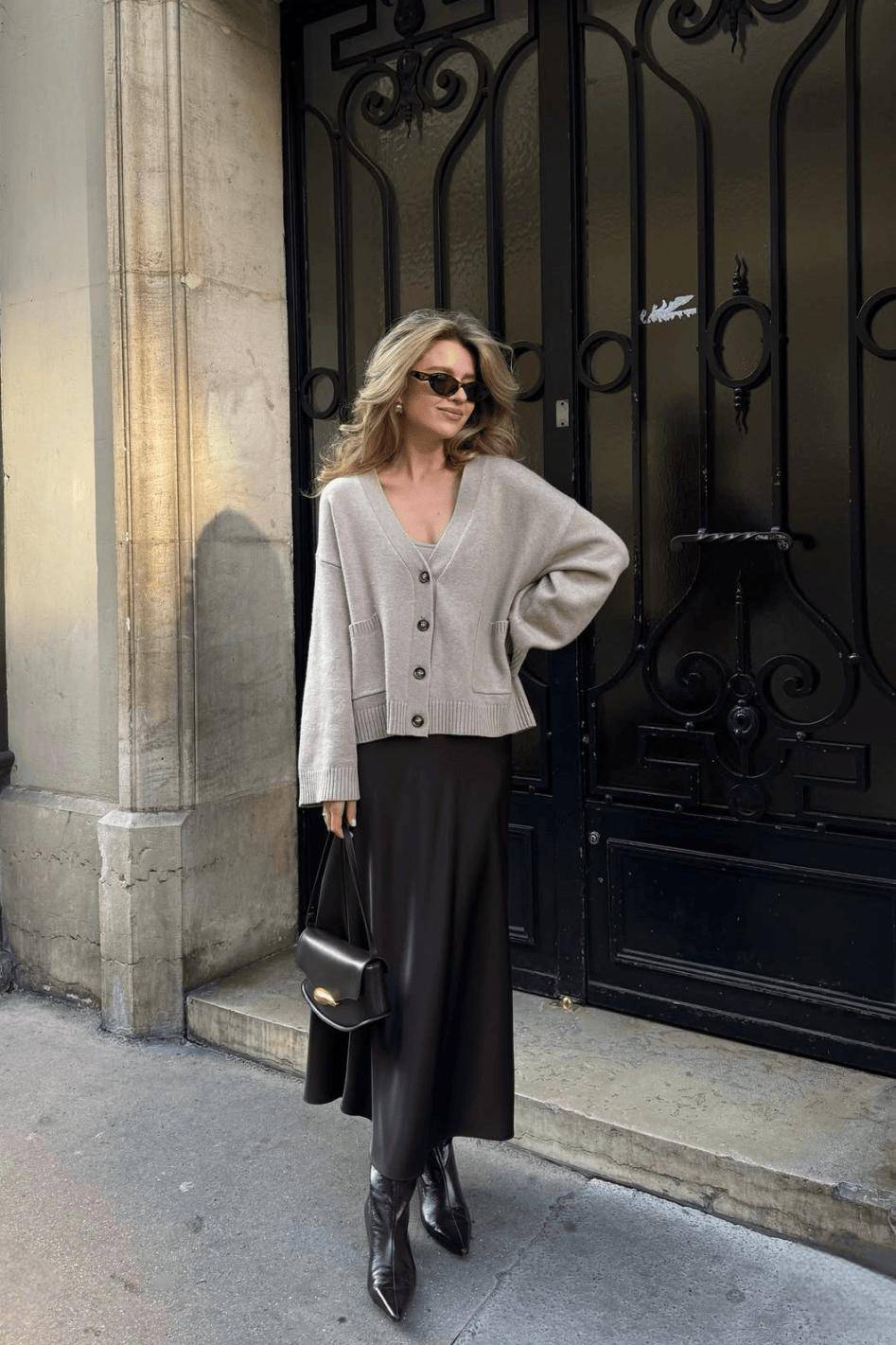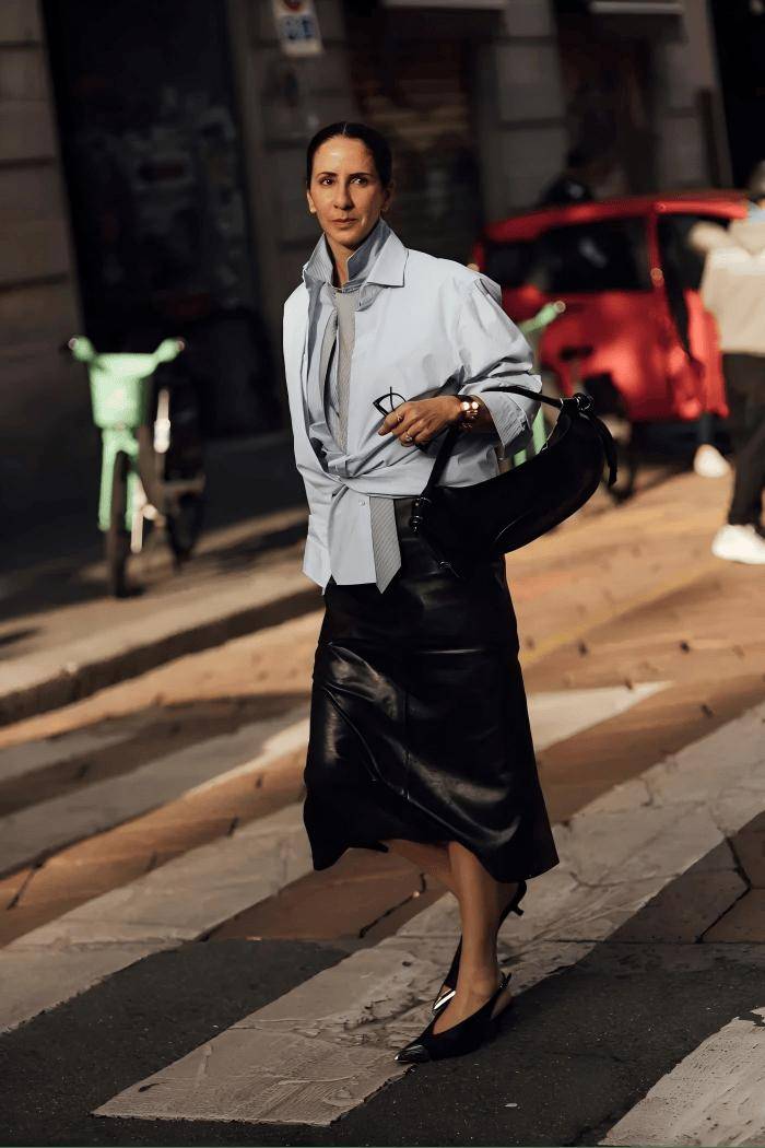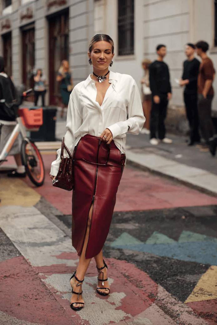 皮革:本季大放异彩,哑光皮革中长裙兼具挺括感与低调光泽,既保暖又显高级,秋冬搭配短款外套或毛衣皆宜。