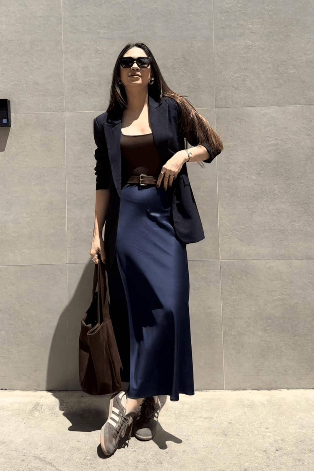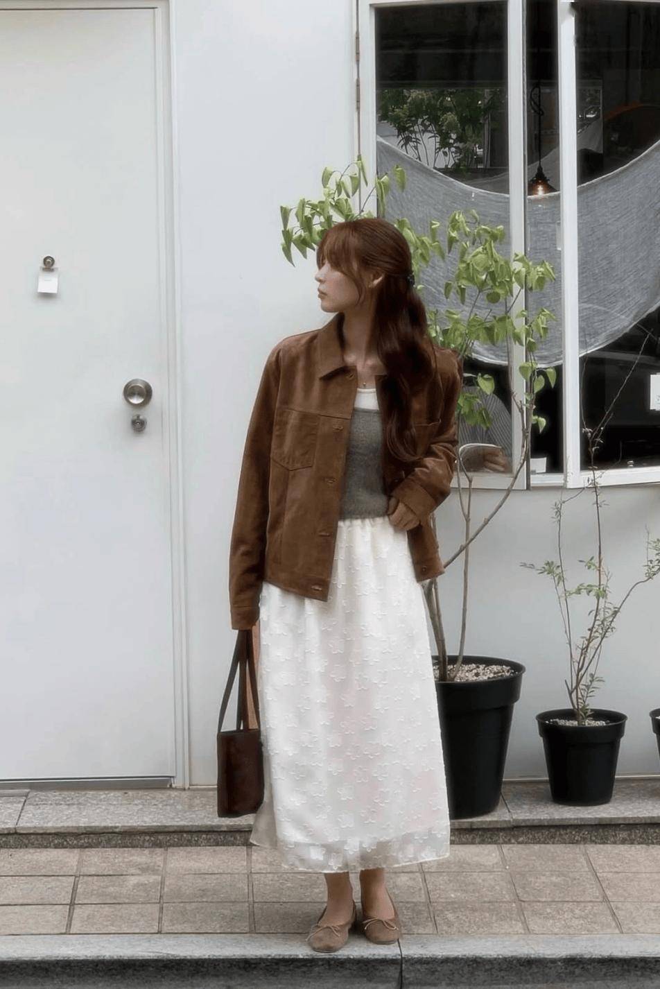 约会穿搭需在精致与自然间找到微妙平衡,中长半身裙的浪漫属性此刻得以淋漓尽致地展现。Oversize上衣搭配真丝或纱质中长半身裙,便是无需多言的约会范本。