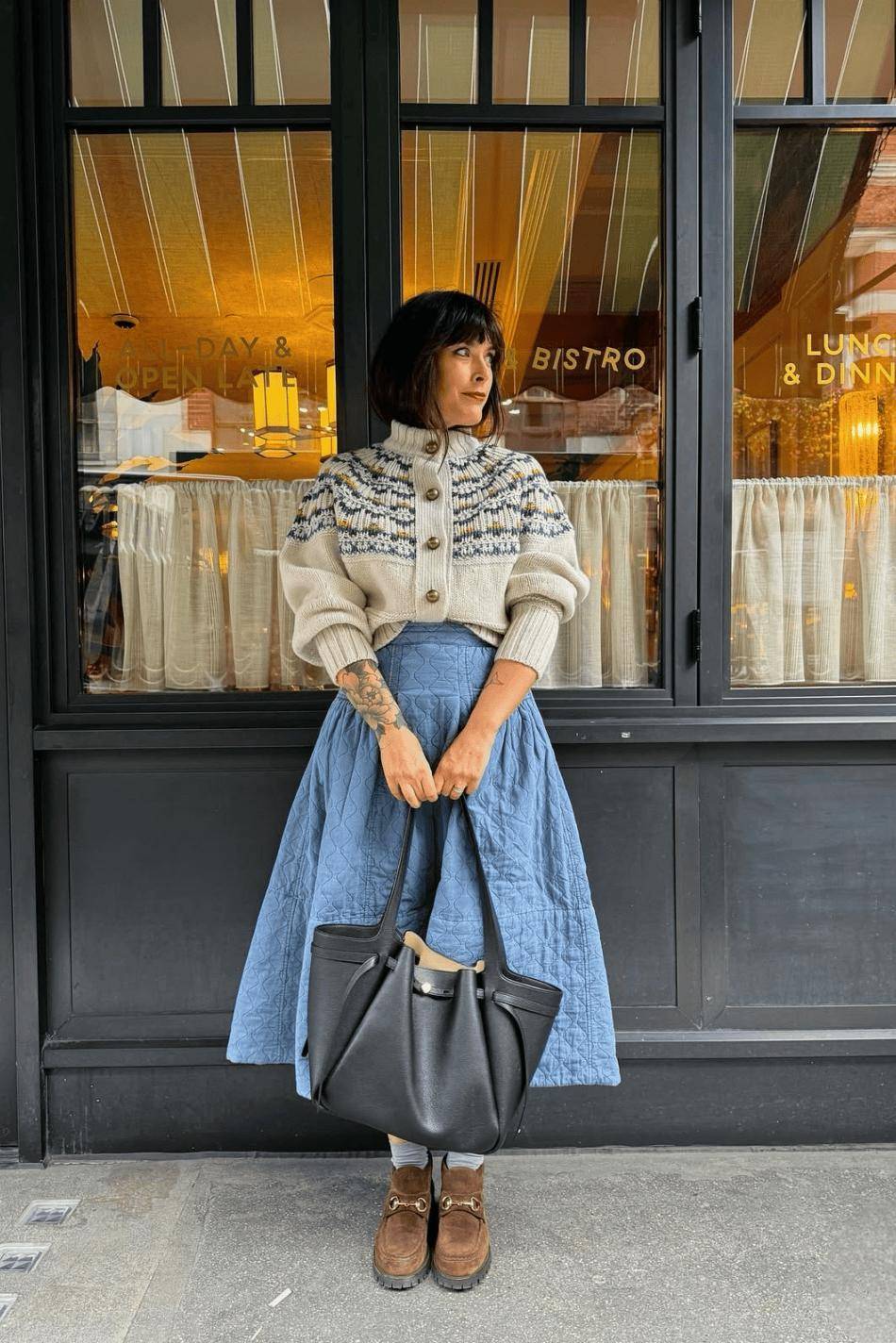 多样可能:Oversize外套能巧妙弱化身材短板;选择挺括的牛仔面料,能让裙摆更具造型感,T恤下摆随意塞入裙腰,随手一拍即是街拍大片。搭配宽松卫衣与休闲运动鞋,可复刻千禧年的青春活力,深受复古爱好者青睐。经典条纹或格纹中长裙,与运动或街头元素结合,亦能展现随性不羁的时髦态度。