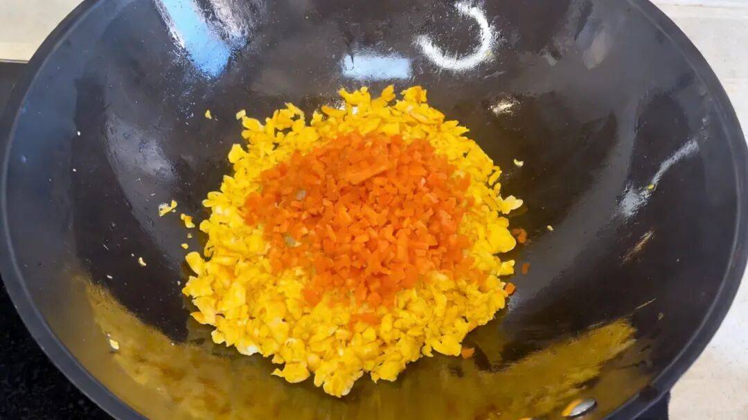 3,油热倒入4个搅散的蛋液,快速划散炒成小块。再准备半碗胡萝卜丁倒鸡蛋里,翻炒至断生。胡萝卜一是增加配色,二来补充营养,用油炒一下更营养,炒好后盛出放凉备用。