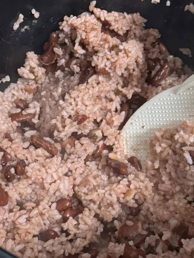 芸豆烀好之后,放在饭锅里一起焖熟,米饭上有豆子的颜色,有点深红色的感觉,看起来更有食欲,一般饭店的米饭都做它,因为吃起来会更香一些!