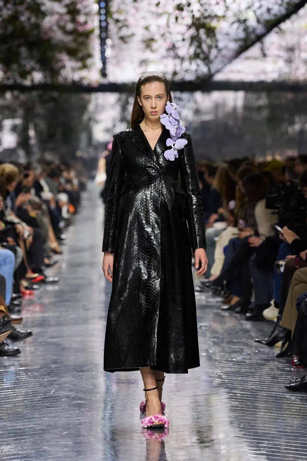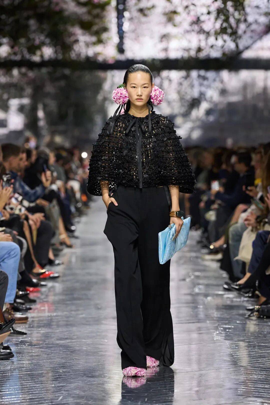 Dior经典的Bar Jacket在本季被拆解重塑,幻化出数十种截然不同的表达——从鳄鱼皮高腰大衣到蝴蝶结饰花型下摆西装,Anderson既尊重传统,又大胆创新。 本季最引人注目的突破在于Anderson对高定传统边界的挑战。他首次将针织材质郑重引入高定语境。 从镂空针织礼服裙到结构精妙的羊绒针织衫,Anderson证明即便是富有日常感的面料,也能在顶级工艺中展现高定的尊严。“针织在高订中大有可为,”他表示,“尤其是当纱线与编织同步完成之时”。
