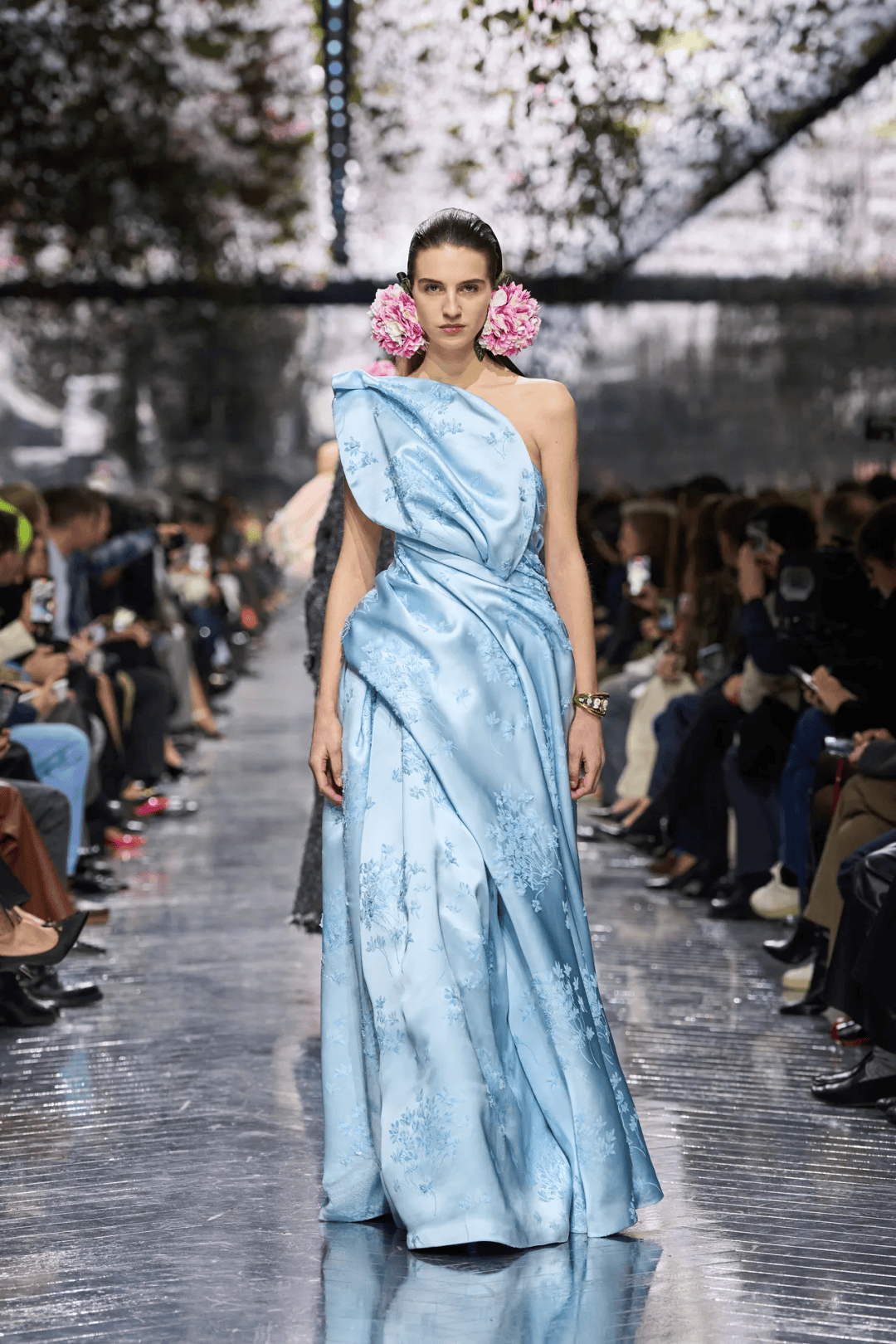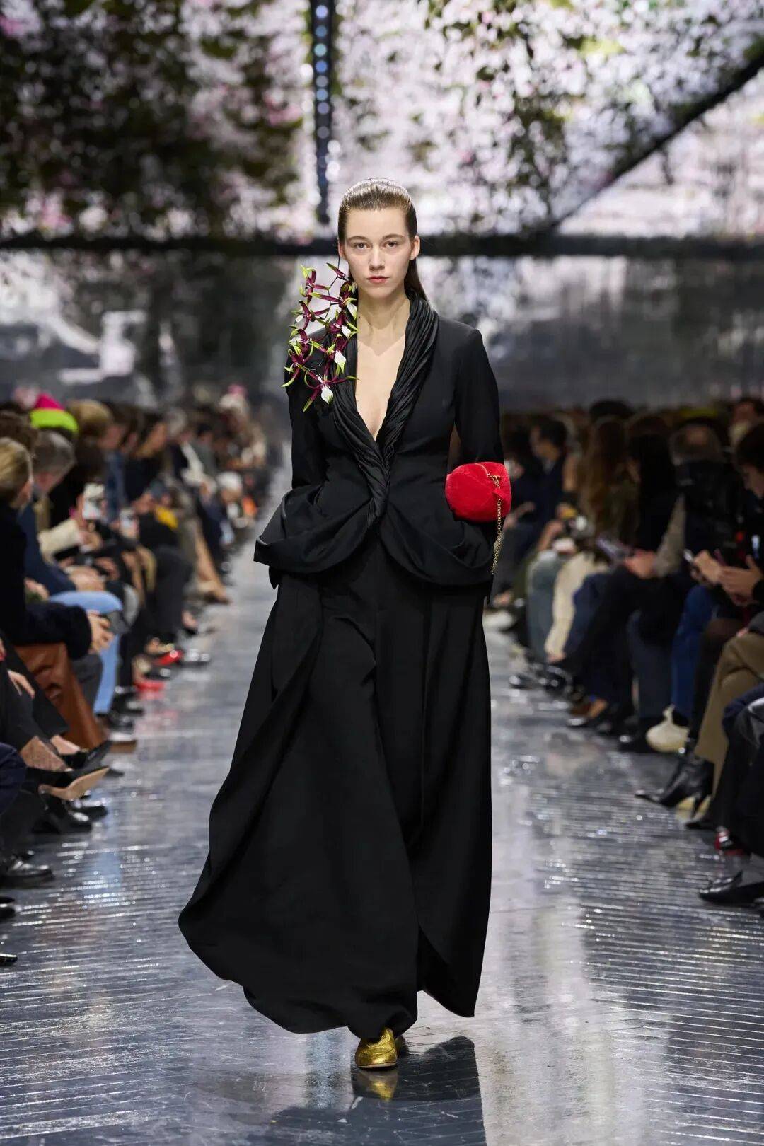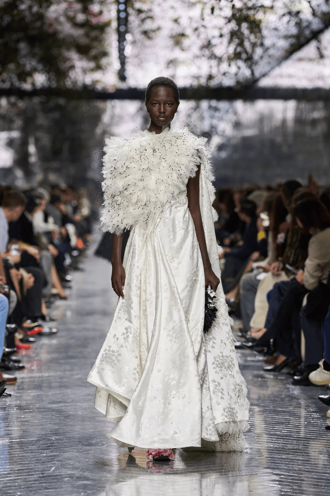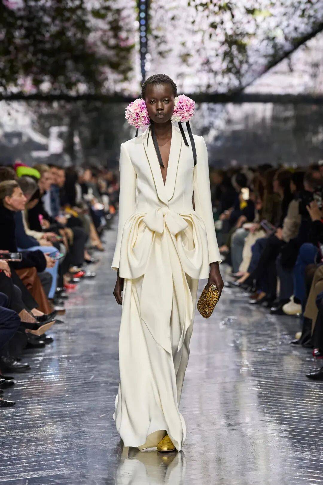 nderson从英国陶艺家Magdalene Odundo的作品中汲取灵感,探索身体、服装与生命力的关联。 开场三套造型以传统钟形裙为原型,却以陶艺拉坯时的旋动形态为灵感,塑造出动态感的褶皱。所有线条最终归于裙摆下方的蝴蝶结,整条裙子随着模特的走动轻盈起伏,如同蓬松的云朵。 Odundo陶器作品中圆润的壶身启发了更多造型,但无论廓形多么庞大,它们都展现出惊人的轻盈感。这种设计理念体现了Anderson对高定服装的新理解:形态不再服务于装饰,而成为一种语言——关于身体如何被回应,也关于时间如何在当下被重新安放。