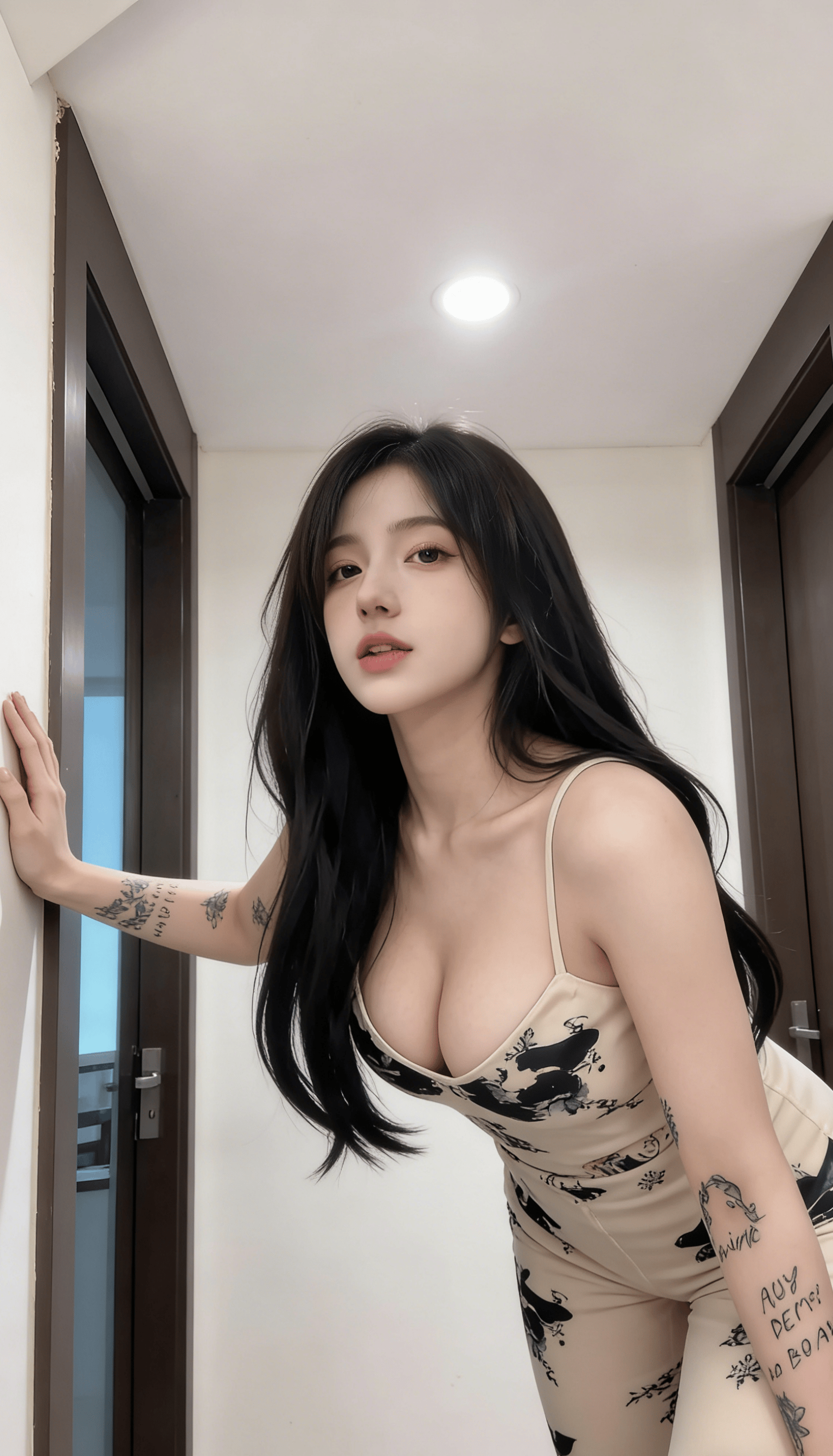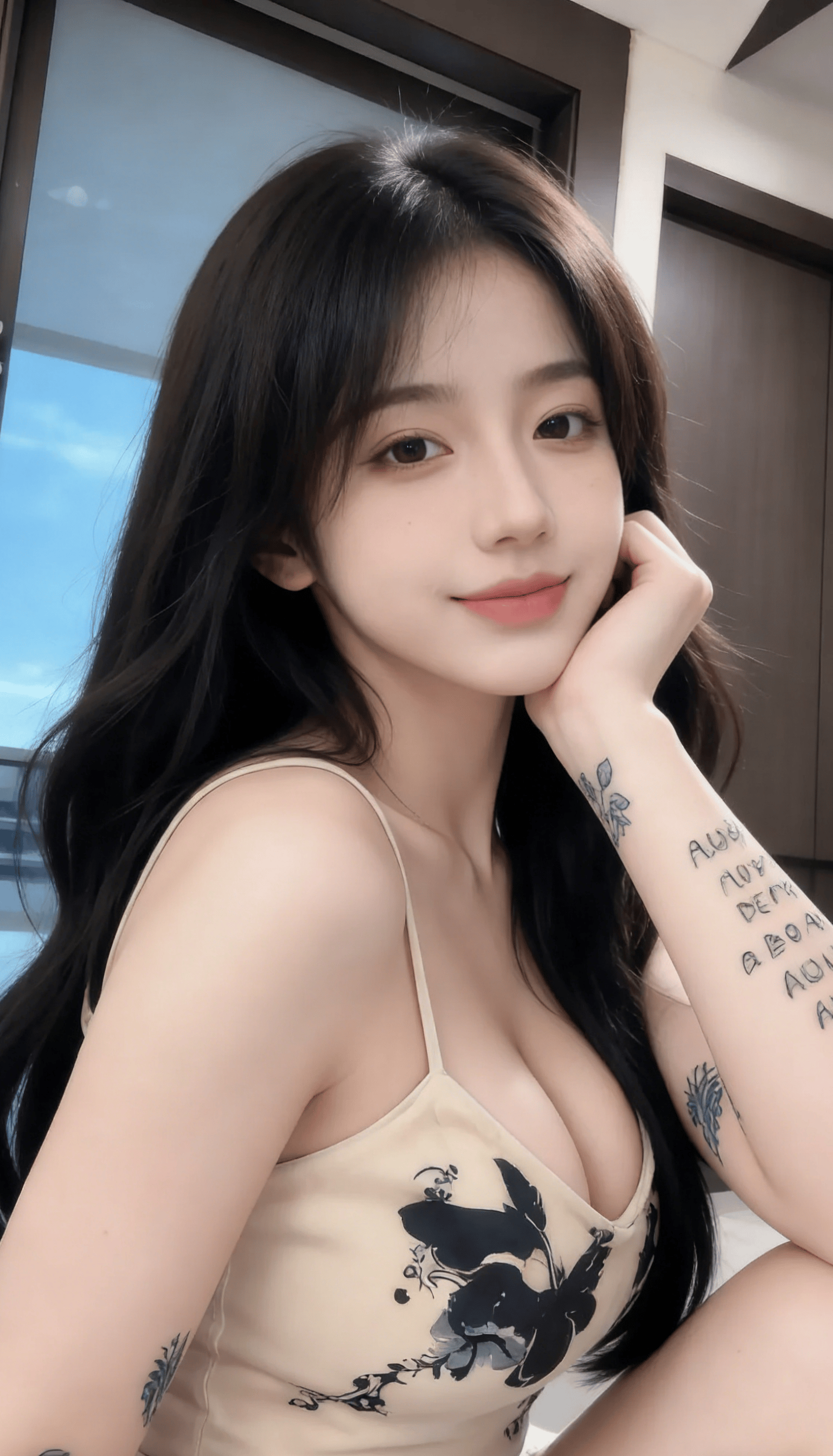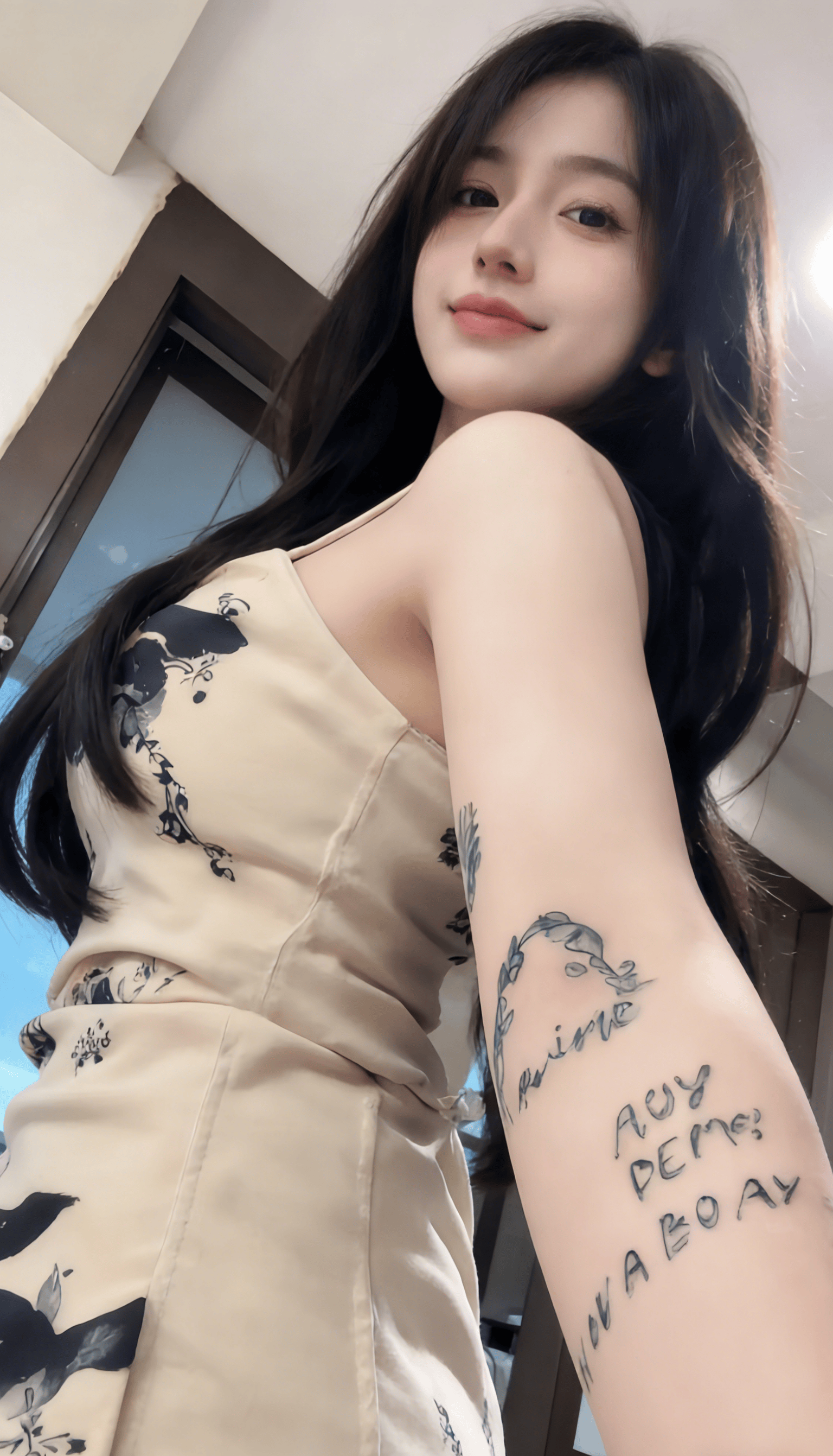 窗外的蓝天是最干净的背景,室内暖光落在芝芙的锁骨和肩颈线条上,把皮肤衬得愈发细腻。没有刻意摆拍的僵硬,只有松弛到骨子里的性感:吊带的细带在肩头若隐若现,腰臀处的面料轻轻绷出弧度,连纹身的纹路都跟着添了几分暧昧。这种 “又纯又野” 的反差感,才是流量密码 —— 不用擦边,就靠一个眼神、一身穿搭,让所有目光都钉在她身上。