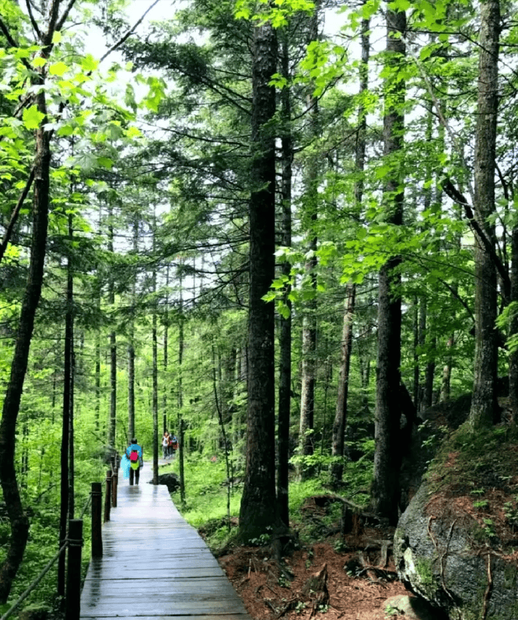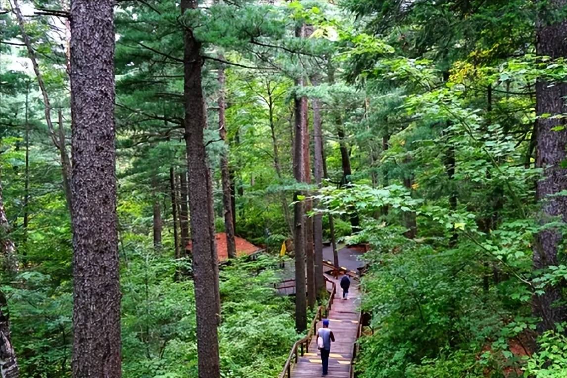地下森林,这是景区的最后一个景点。沿着曲曲折折的人工木栈道,在遮天蔽日的原始森林中,走了4、5里路,直到一片低于地面几十米的断层前,才见到了那片“地下”的森林。其中还经过从地下十几米深处的岩石中流过的松花江,被称为“一步跨过松花江”。