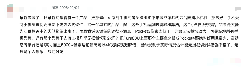 “ 早就该做了,我早就幻想着有一个产品,把那些 Ultra 系列手机的镜头模组扣下来做成单独的云台防抖小相机...... ”