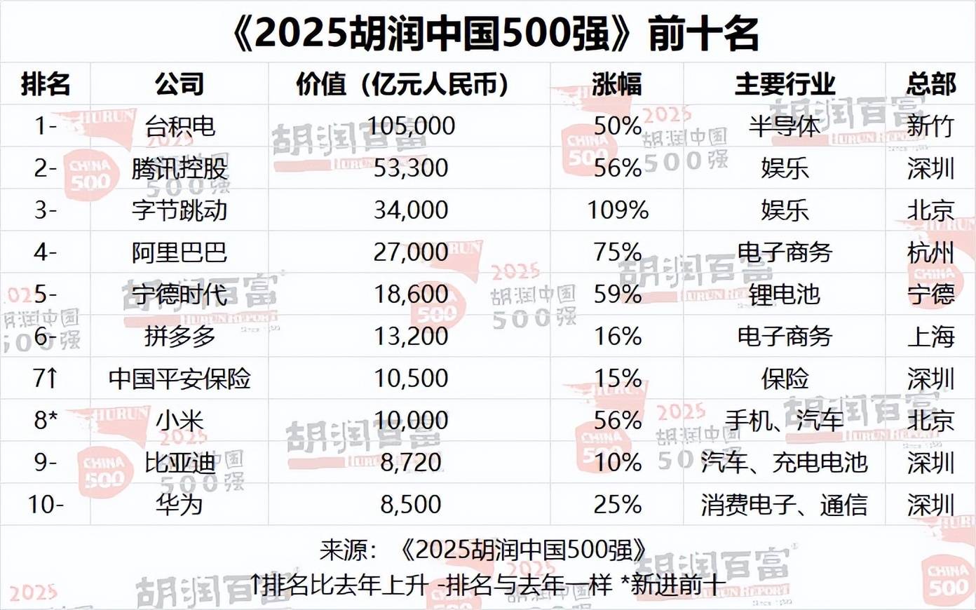 “ 2025 胡润中国 500 强 ” 数据刷新,信息量有点大,小米首次闯进该榜单前 10 ,且也是第一次超过了华为。