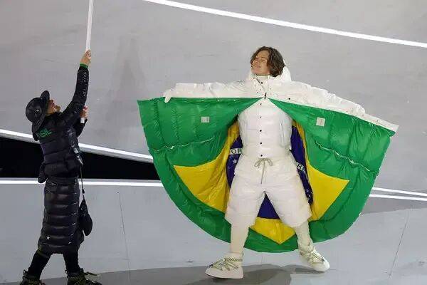 Moncler给巴西旗手设计的羽绒服也火了,旗手直接把外套当成斗篷一样展开,瞬间露出蓝绿金的巴西国旗内衬,视觉冲击超强。